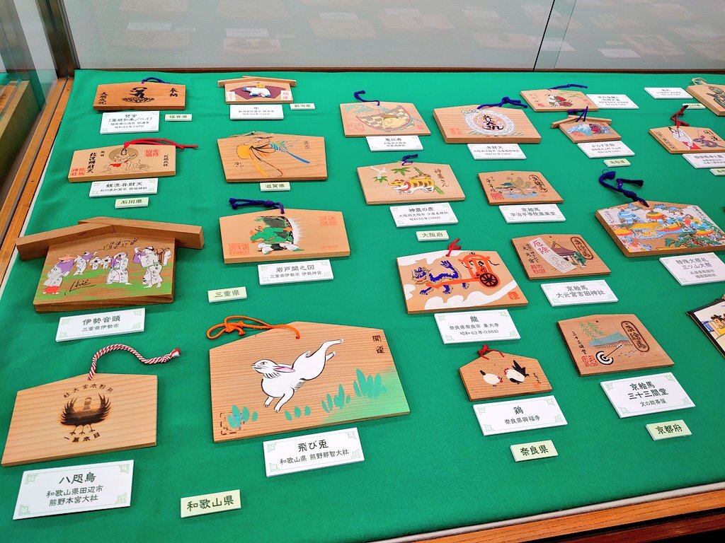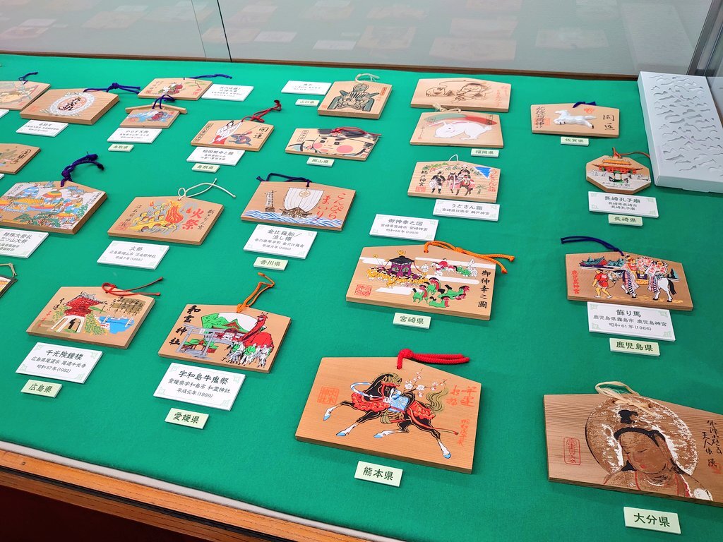 〈企画展「#絵馬展」開催中〉 写真は、本展に並んだ絵馬のほんの一部。 形や素材にも違いがあるのがわかると思います。 奈良時代は横長・長方形の薄い板であったようですが、室町時代には上辺が屋根型になる形もでてきます。江戸時代後期には、縦長や枠付等、様々な形が見られるようになります。 pic.x.com/CYyldatdkQ