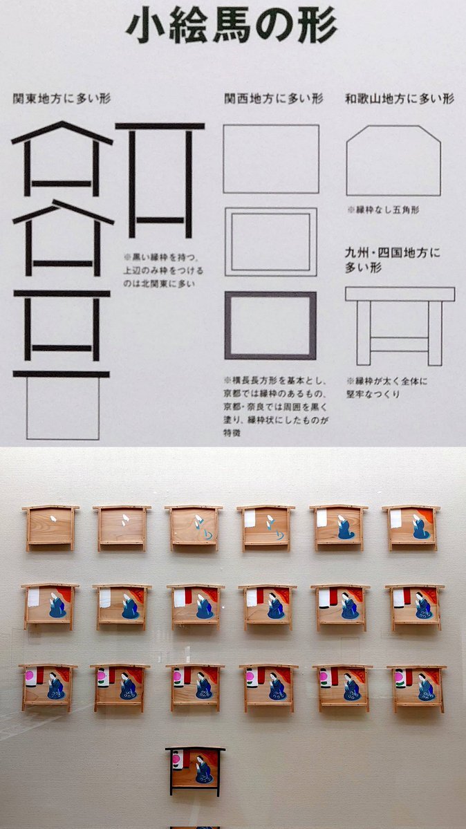〈企画展「#絵馬展」開催中〉 関東地方には黒枠のものが多く、関西地方では横長長方形を基本とし、京都では縁枠のあるもの、京都・奈良では周囲を黒く塗り、縁枠状にしたものが多く見られます。和歌山地方では、縁枠のない五角形、九州地方では縁枠が太く全体にガッシリしたものが多いようです。 pic.x.com/vEXFw9QduW