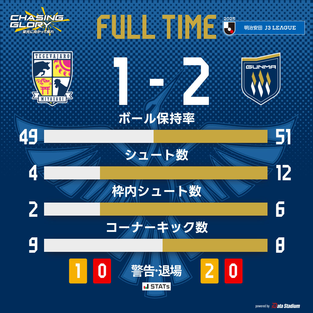 試合終了 🏆明治安田J3リーグ 第35節 #テゲバジャーロ宮崎 1-2 #ザスパ群馬 🔵見逃し配信放送中 #DAZN 加入はこちらから ➡rcv.ixd.dmm.com/api/surl?urid=… #thespa #ChasingGlory