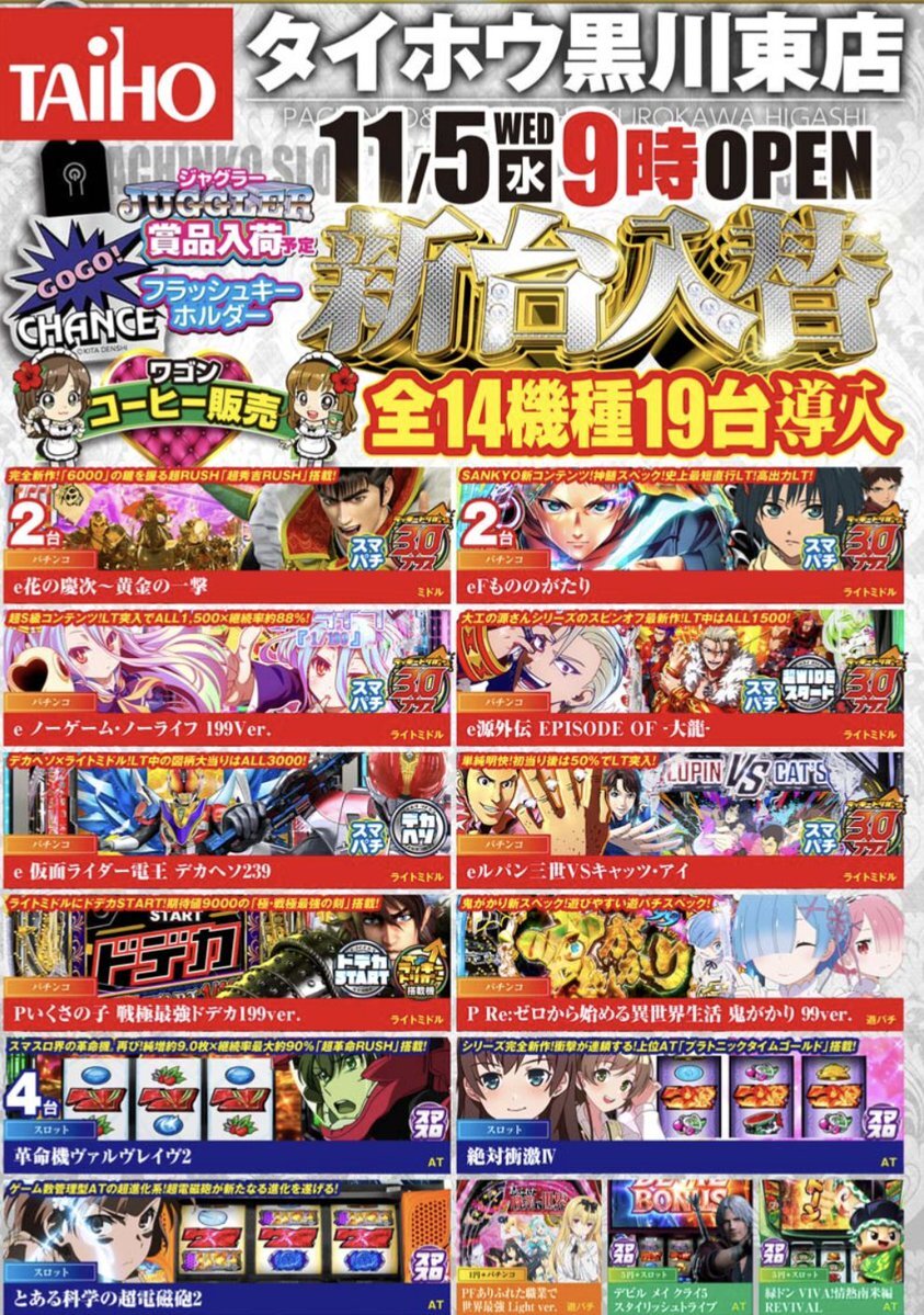 明日 1⃣1⃣月5⃣日(水) #新台入替 &#ジャグラーグッズ入荷🤡 朝9️⃣時オープン ◆パチ #Fもののがたり #慶次黄金の一撃 #ノーゲームノーライフ など11機種 ◆スロ #ヴァルヴ2 #絶対衝撃フォース など ❤ワゴン販売あります☕❤ pic.x.com/votunz7J5D