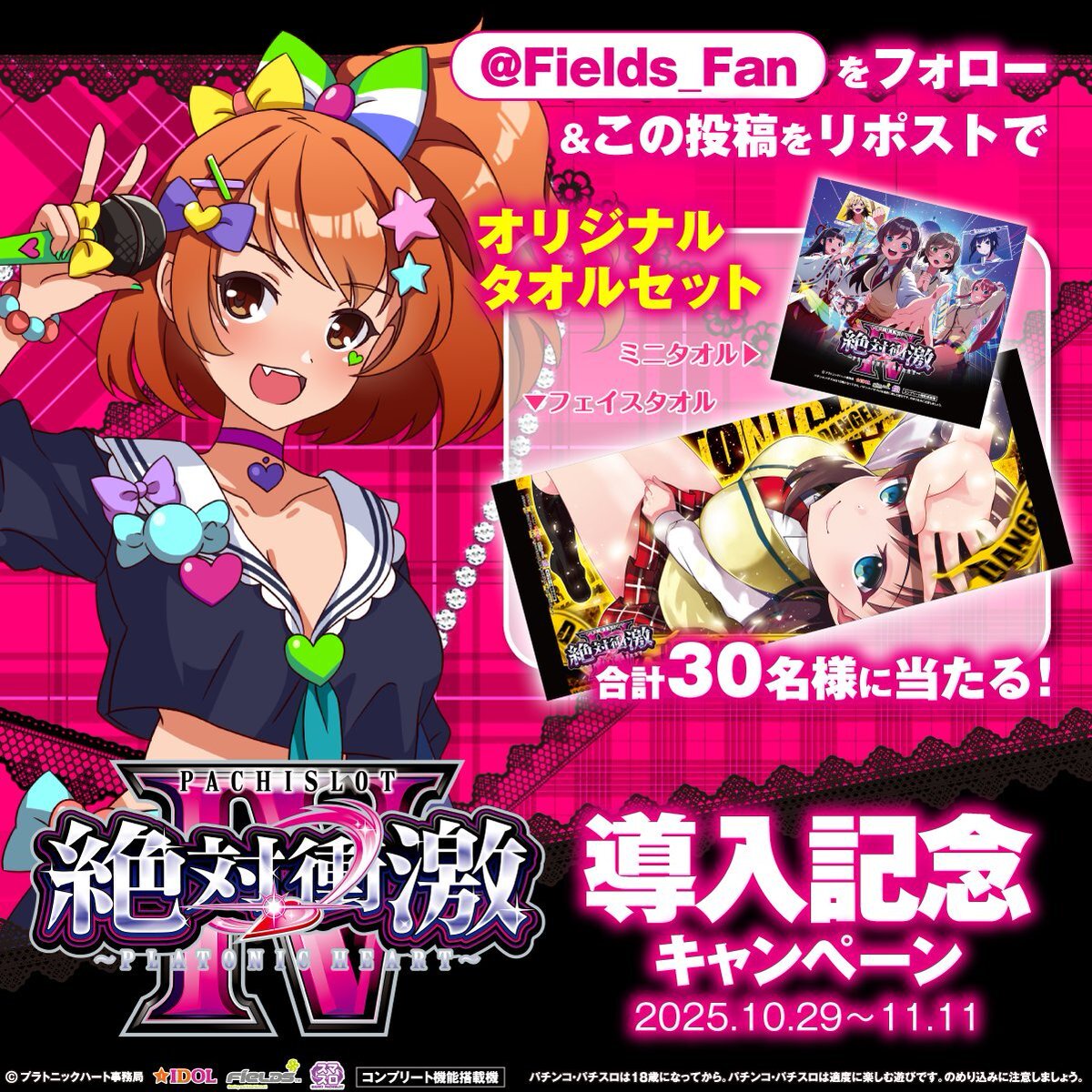 💞L 絶対衝激IV💞 導入記念キャンペーン フォロー&リポストで オリジナルタオルセットが 合計30名様に当たる! ①@Fields_Fan をフォロー ②本投稿を11/11 23:59までにリポスト ③当選者のみ後日DM #絶対衝激 #絶対衝激4 #パチスロ pic.x.com/IWc4ebBPeq