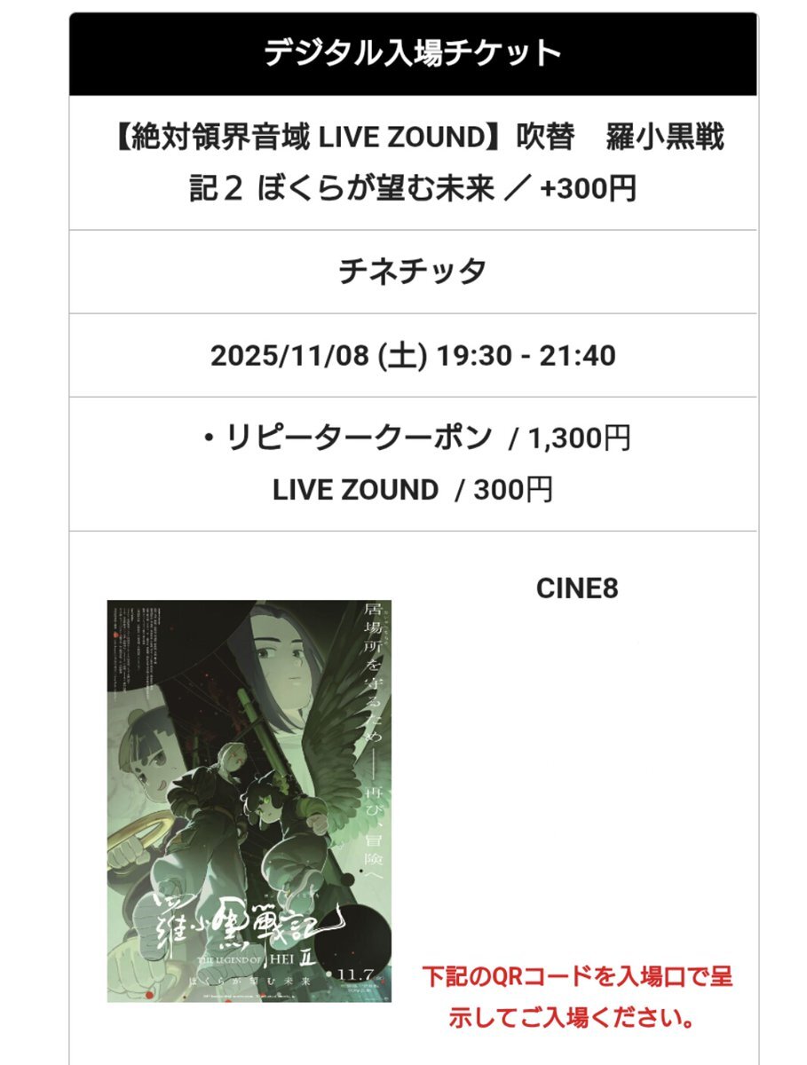 累計1回目の羅小黒戦記2 ぼくらが望む未来をブルク13 シアター1 H-16にて。 今週最大の期待作を吹替版で。チネのリバイバルで復習したし、準備も万全。 桜木町は普段から規定値音量で上映してそうだけど、 #絶対領界音域 銘で明記してくれるのも嬉しいところ。 #箱巡り2025 pic.x.com/2t9Ns78xZ5