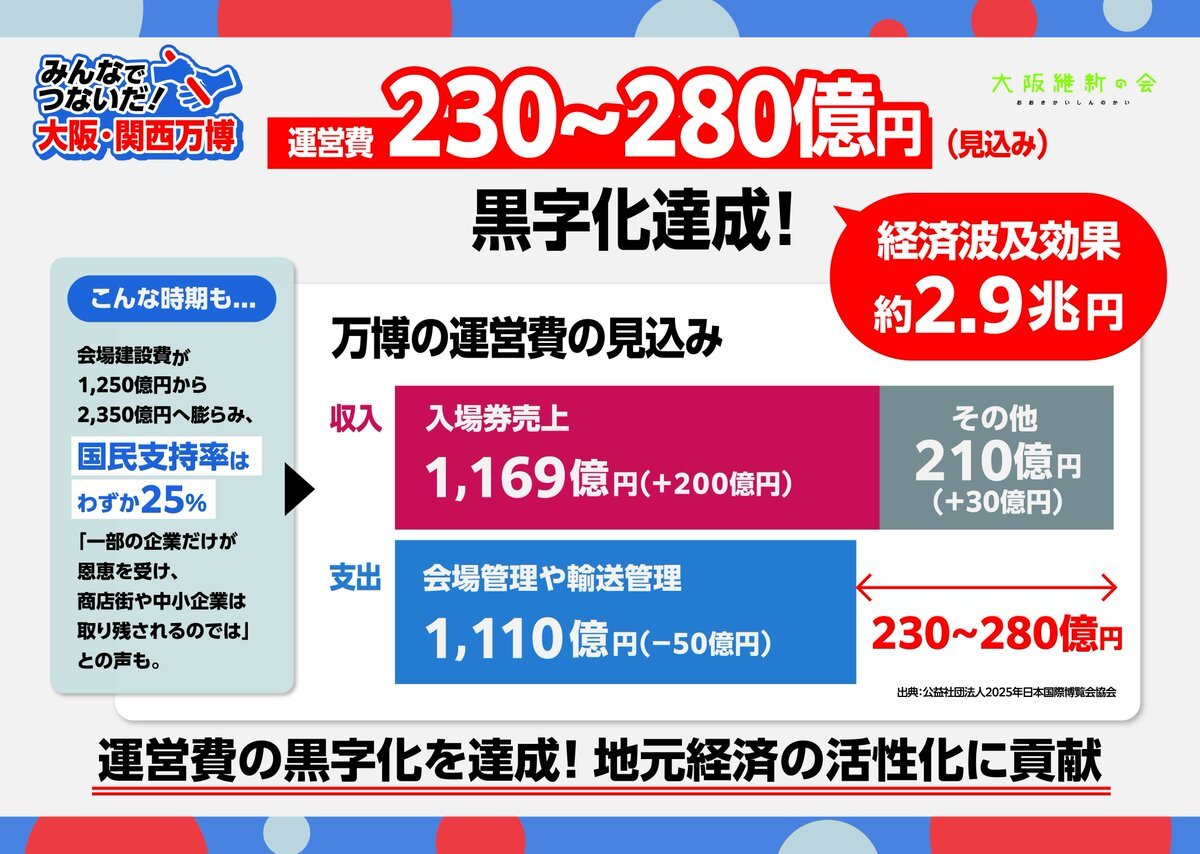 🎉みんなで繋いだ!大阪・関西万博①🎉 建設費2,350億円への膨張、国民支持率25%という厳しい状況も、皆様と共に乗り越えました!🤝✨ 当初の懸念を払拭し 、確かな成果を上げることができました!✨ ✅運営費の黒字化を達成! 地元経済の活性化に貢献します!