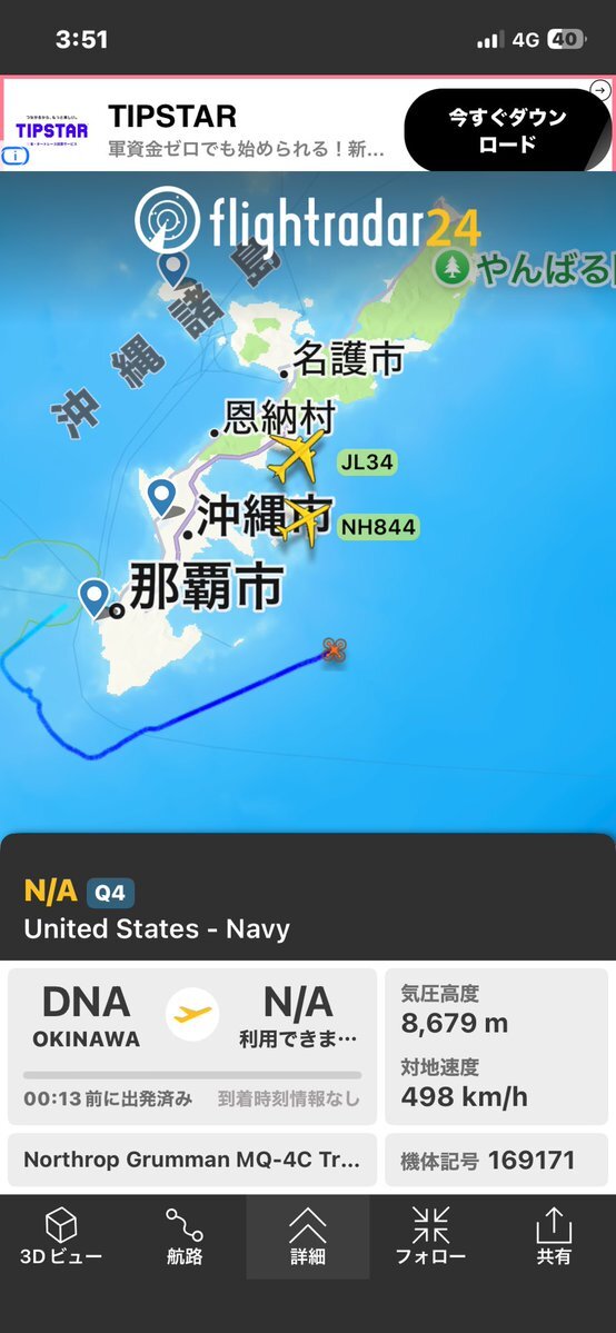 米海軍 洋上監視無人偵察機 ノースロップグラマン製 MQ-4Cトライトン 単発ターボファンエンジン ビューロナンバー:169307 HexMode:AE625B 嘉手納RWY23から離陸03:26JST 久高島東方まで戻って来た 09:25JST #OHアラート