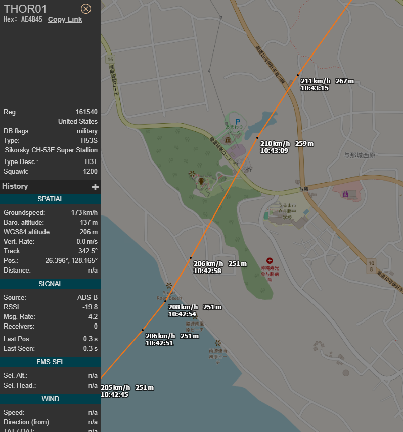 THOR01, AE4B45, CH-53E 平日、子どもたちが勉強中の与勝中学校のすぐ近く、そして、世界遺産の勝連城址の上空を飛行 #OHアラート #米軍機世界遺産上空飛行