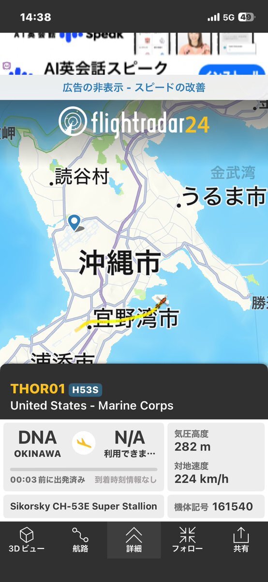 8:15 嘉手納飛行場から戦闘機1機爆音で離陸。勝連半島から3分くらい音が聞こえる #OHアラート