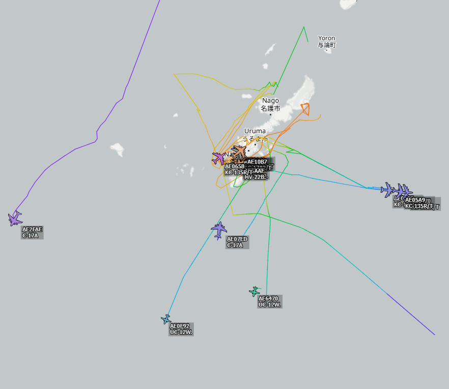 2025/11/4 21:55:59~7:34:02にここで取れた軍用機 グレーの人とC-17のうち一匹は除外して 深夜早朝11匹 #OHアラート
