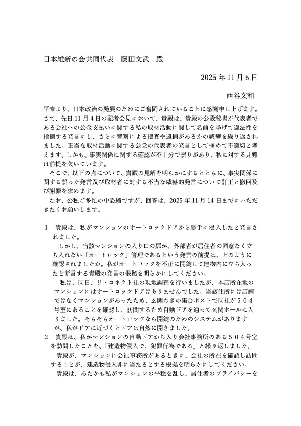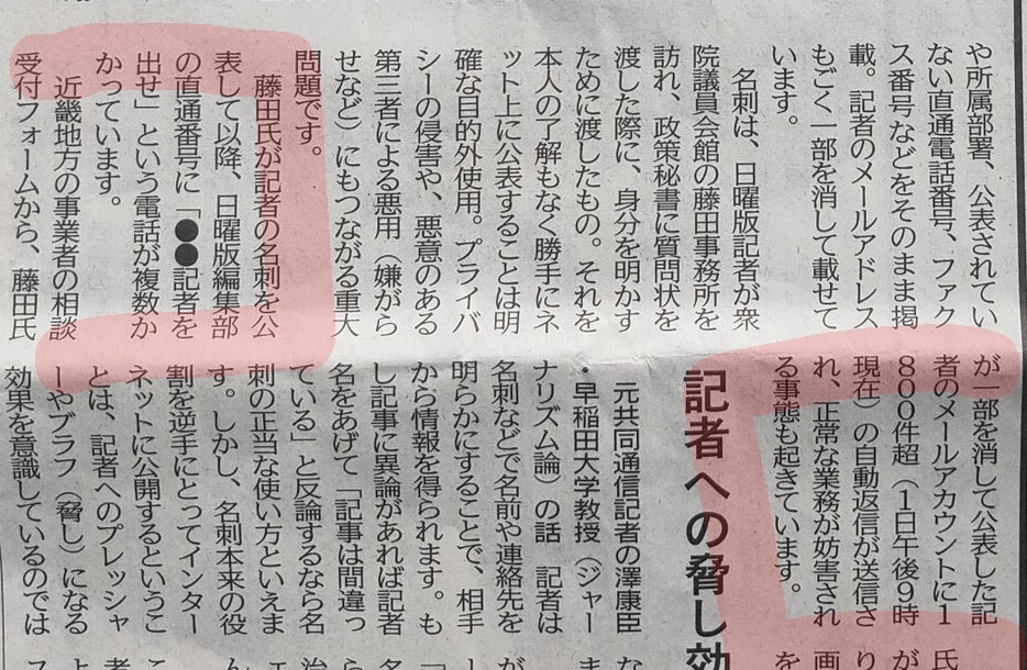 藤田氏がXで公表した記者の名刺には、記者個人の氏名、所属、連絡先などの個人情報が記載。「与党の共同代表が、自身に批判的な取材記者の名刺をネット上に公表することは、権力監視の報道を妨害し威嚇するもの #維新は個人情報保護法違反 #維新の犬笛 #維新の言論弾圧 news.yahoo.co.jp/articles/06b5e…