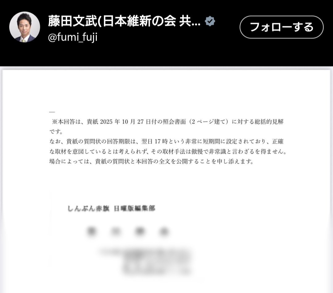 損害賠償請求されてもおかしくないんじゃないですかね? 当然今日の会見では、なぜ記者の名刺までXで公開したのか具体的な理由を回答して貰えるんですよね? #維新は害悪 #維新の犬笛 #維新は利権と汚職と税金泥棒 #公金ロンダリング #藤田文武 pic.x.com/AlRQnM2GGT x.com/fumi_fuji/stat…