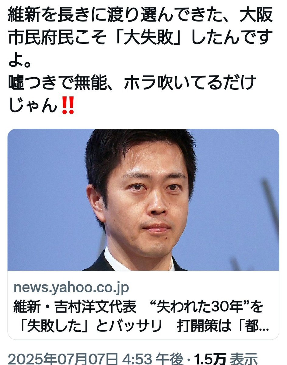 💩流石は暴力団詐欺師犯罪者集団統一教会大阪維新の会💩🤣 ホラを吹かせたら宇宙一🤣🤣 #維新は平気で嘘をつく #維新は利権と汚職と税金泥棒 #維新は日本に必要ない政党 #維新クオリティ #維新は日本国民の敵 #維新は日本国の敵 #自民党の🐶💩 pic.x.com/IBRtV7ngxr x.com/fumi_fuji/stat…