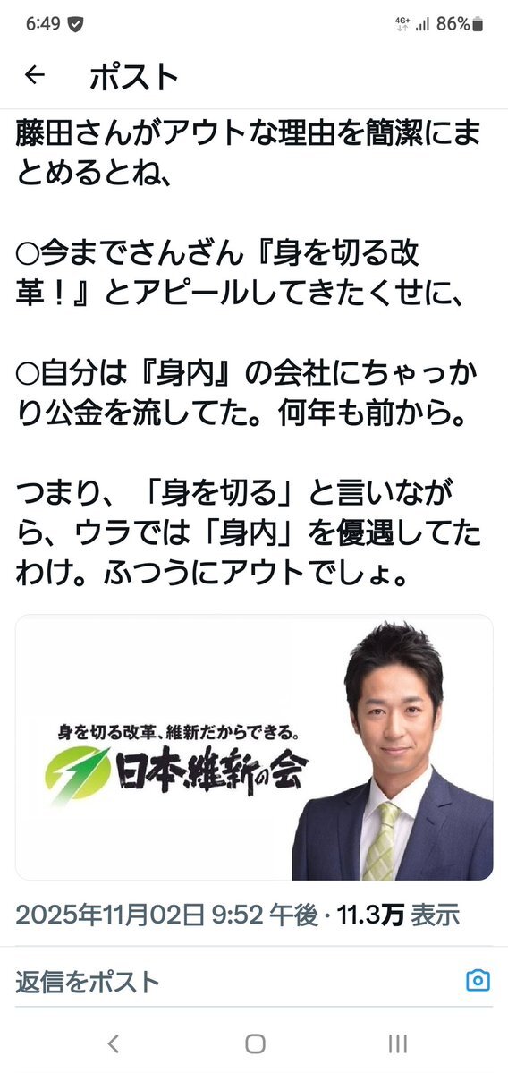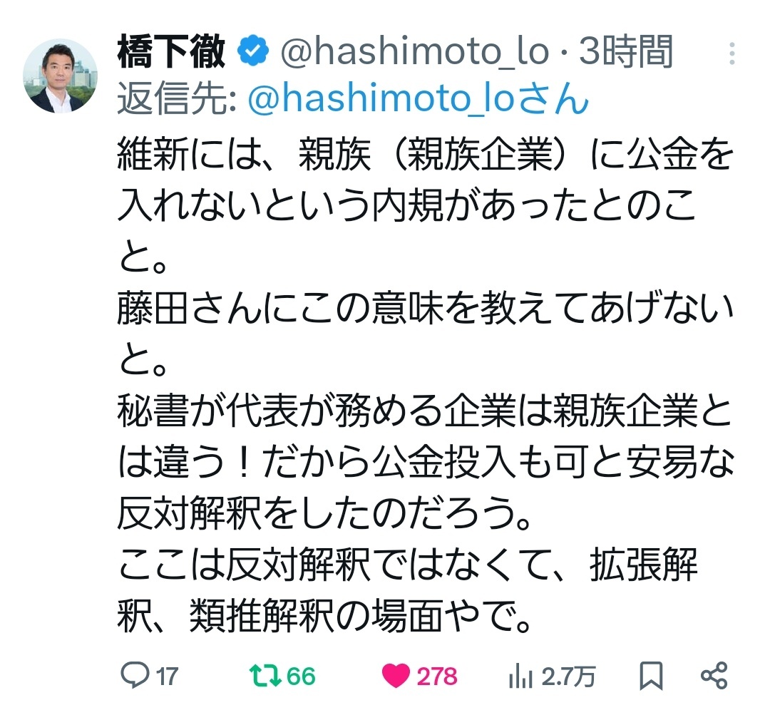 こんな陳腐なポストで立花孝志を擁護しX民を黙られせられると思考した維新ご贔屓脆弱芸人がコチラ。 #維新に騙されるな #維新は平気で嘘をつく #維新はNHK党と一心同体 #維新は統一教会 #NHK党は統一教会 #カルトは日本人の敵 x.com/JiroShinbo_tab…