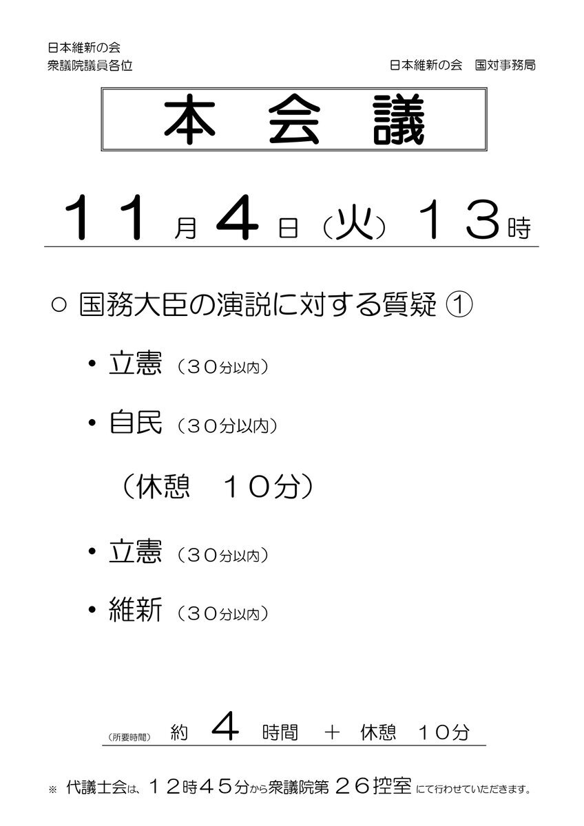 11月4日(月) 所属衆議院議員の登壇予定です。 ◇藤田文武 共同代表 【衆議院本会議】 (質疑予定時間) 16:10~16:40 (内容) 国務大臣の演説に対する質疑 (中継) NHK総合テレビ、NHKラジオ第一、shugiintv.go.jp/jp/index.php #日本再起 #代表質問