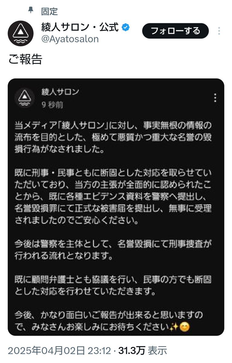 #綾人サロン 反綾人にはそんなお子ちゃまは居ませんよ。 CBCニュースのパクリ、バカバカしくて相手にならない。それより、地元の半グレ集団と綾人サロンの(報道???)は合ってるのかね(笑)名誉毀損は親告罪らしいが、訴状は未だ届かない。クラファンも実績はまだ無いし。大切なのは嘘チェックね😂 pic.x.com/QFaaRCvCMF