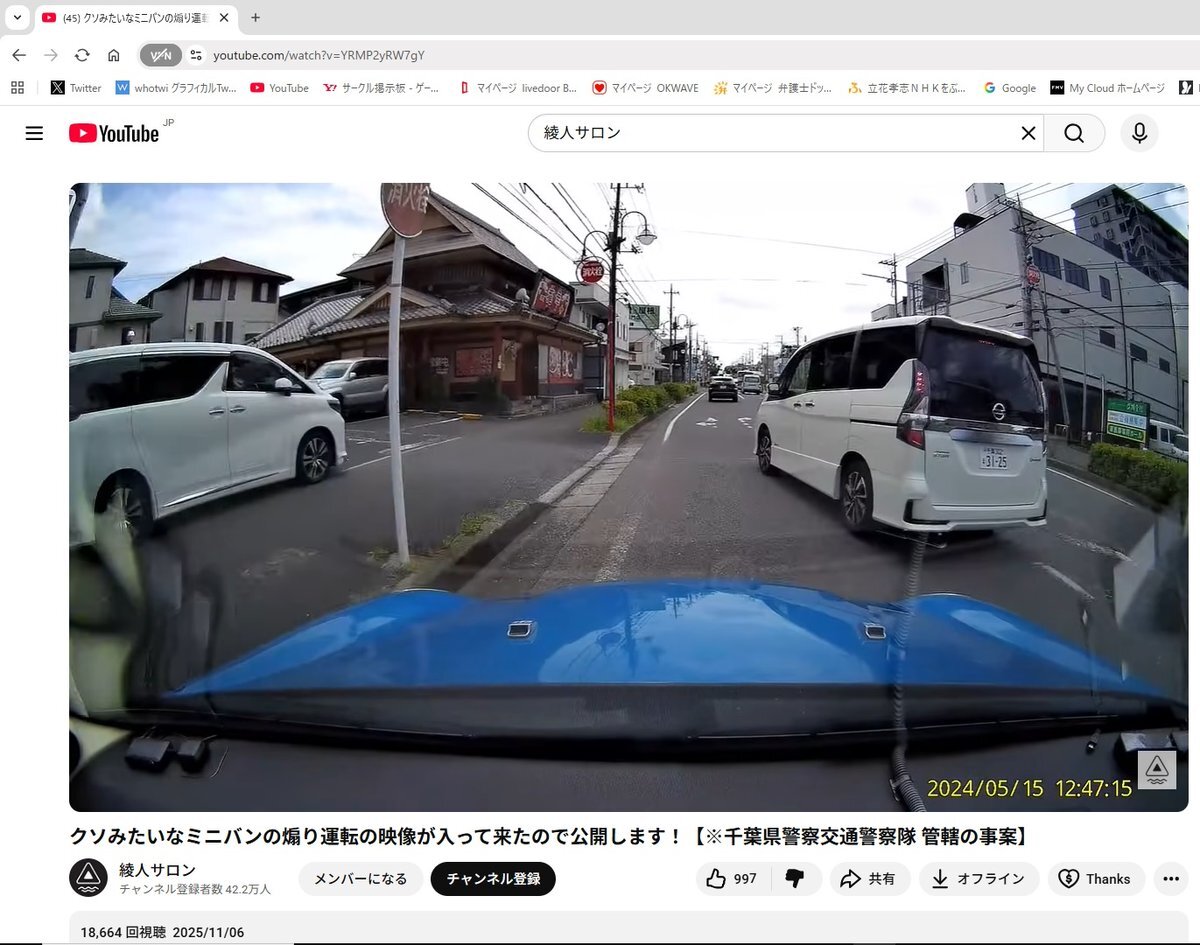 youtu.be/YRMP2yRW7gY クソみたいなミニバンの煽り運転の映像が入って来たので公開します!【※千葉県警察交通警察隊 管轄の事案】 これは綾人サロンの再アップ防止目的のツイートです。 #綾人サロン @Ayatosalon 2025年11月6日(木)のユーチューブ投稿 pic.x.com/MnjikOnveL