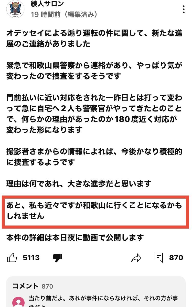 当事者でもない動画を投稿しただけの綾人サロンが、なぜ和歌山に行く必要性があるのでしょう? 久々に登場したフカシワード 「近々」「かもしれません」がダブルで組み込まれたこの呟き 今回もまたフカシの法則が発動してしまうのでしょうか? #近々の法則 #かもしれないの法則 #綾人サロン