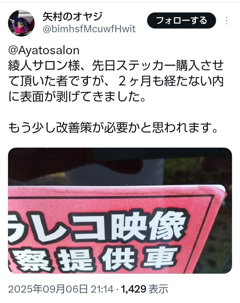 返信先:@Japan_lol_w絶好の布教の場なのに ここまで(2019元ポストにも?) 2枚で2,800円と情弱を騙しぼったくっておきながら、数ヶ月で色褪せ・コーティング剥がれが発生する100均のステッカーにも劣る粗悪品 【綾人サロンステッカーが効果ありますよ】なる、綾人フカシ教信者の布教リプ・布教リポストなし #綾人サロン x.com/ayagikai/statu…
