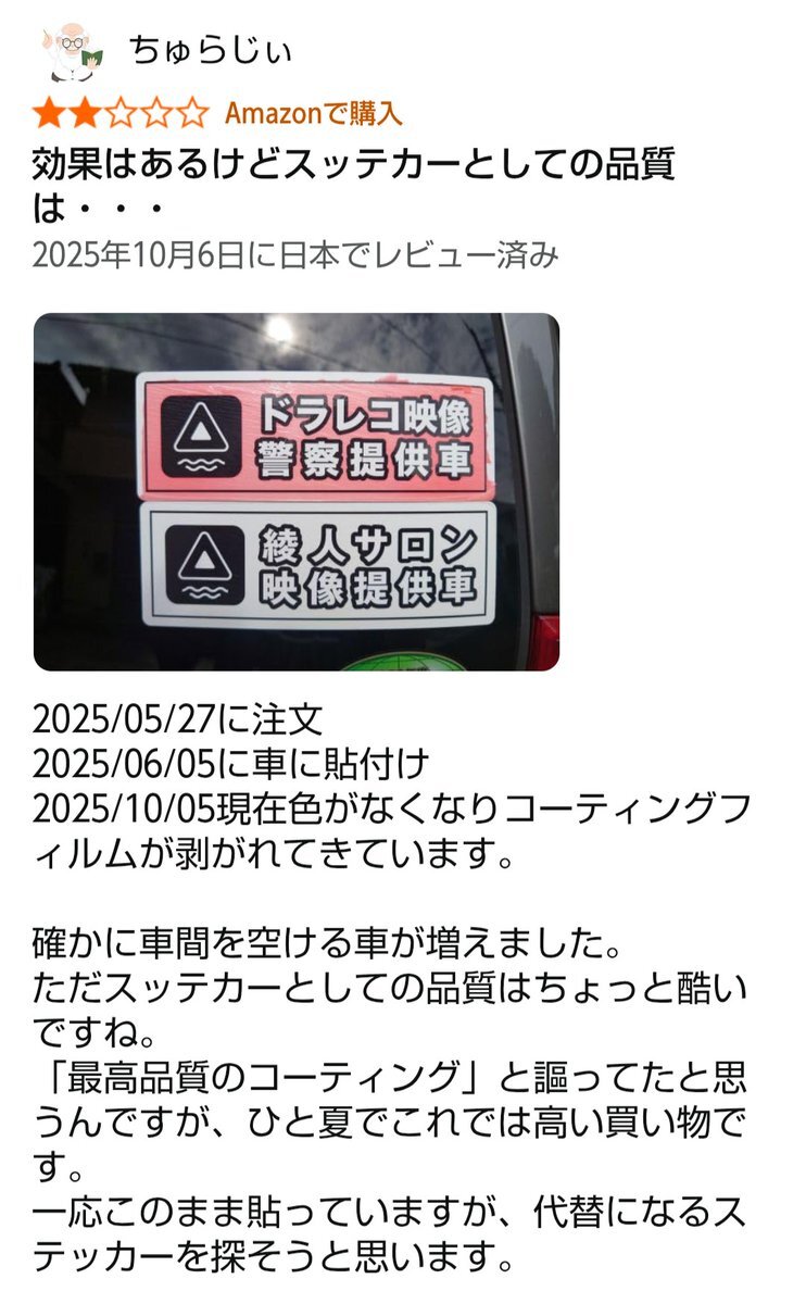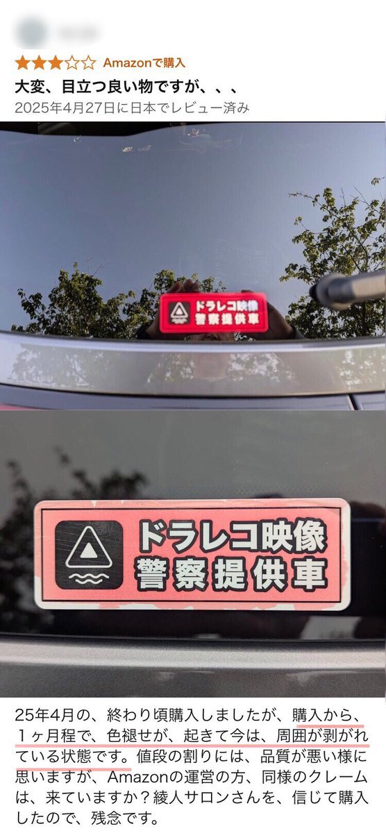 【#綾人サロン ステッカー速攻色褪せ伝説再び】 YouTuber世論調査で報告された Amazonレビューの色褪せステッカー 初の「赤」 今までの報告で最短の1ヶ月で色褪せ() 今回の色褪せ報告後期警察提供者タイプですが、まさか前期タイプの色褪せが発覚してから何も対策をせず発売したのでしょうか? ↓ x.com/Ayagikai/statu…