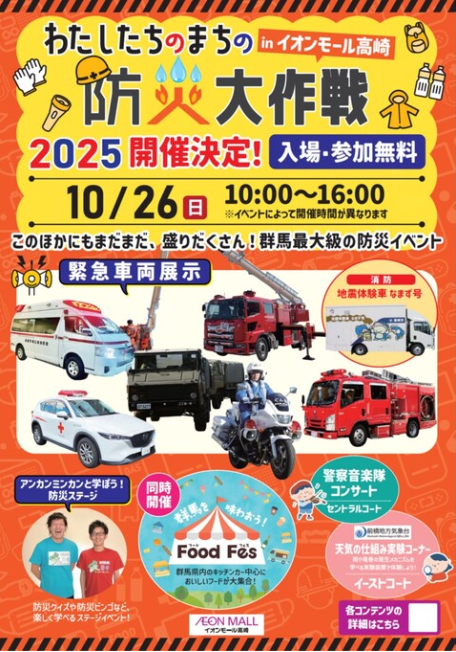 \🚨血液運搬車両に乗ってみよう!🚨/ 10/26㈰ イオンモール高崎で開催される 「わたしたちのまちの防災大作戦2025」に出展します! 救護服を着て、車両に乗って 記念写真を撮ろう📷✨ 当日は献血も実施します🚌🩸 ぜひ、献血のご協力もお願いいたします🙏 🔽イベントの詳細 takasaki-aeonmall.com/news/event/602…