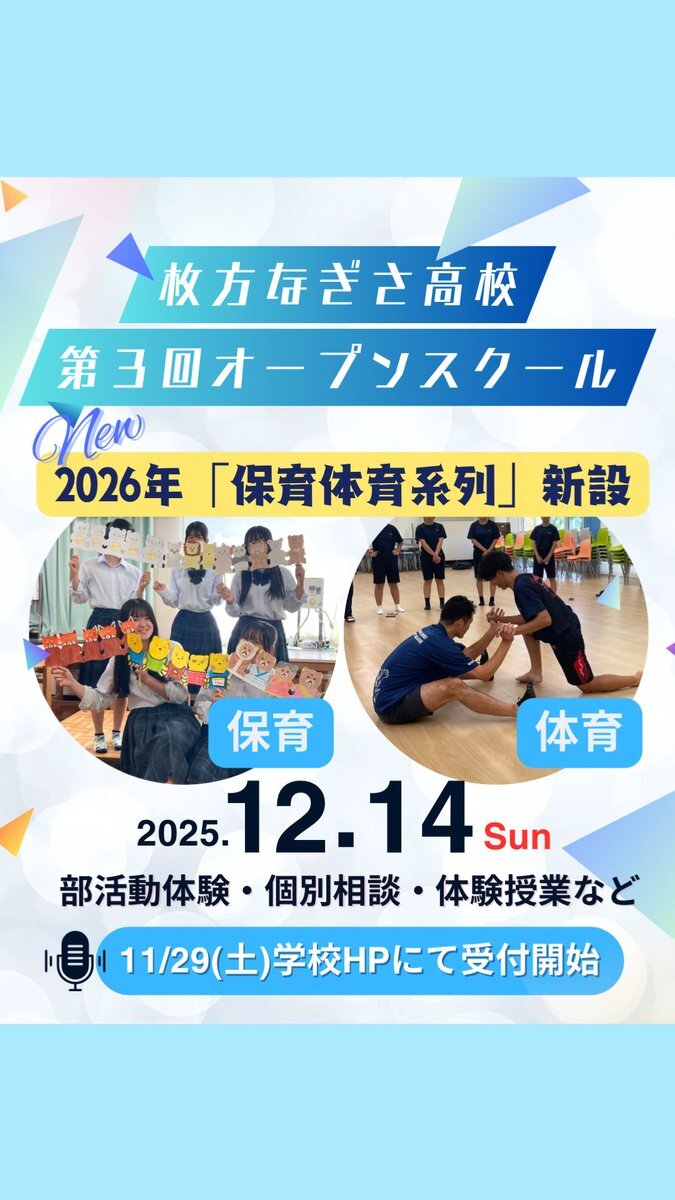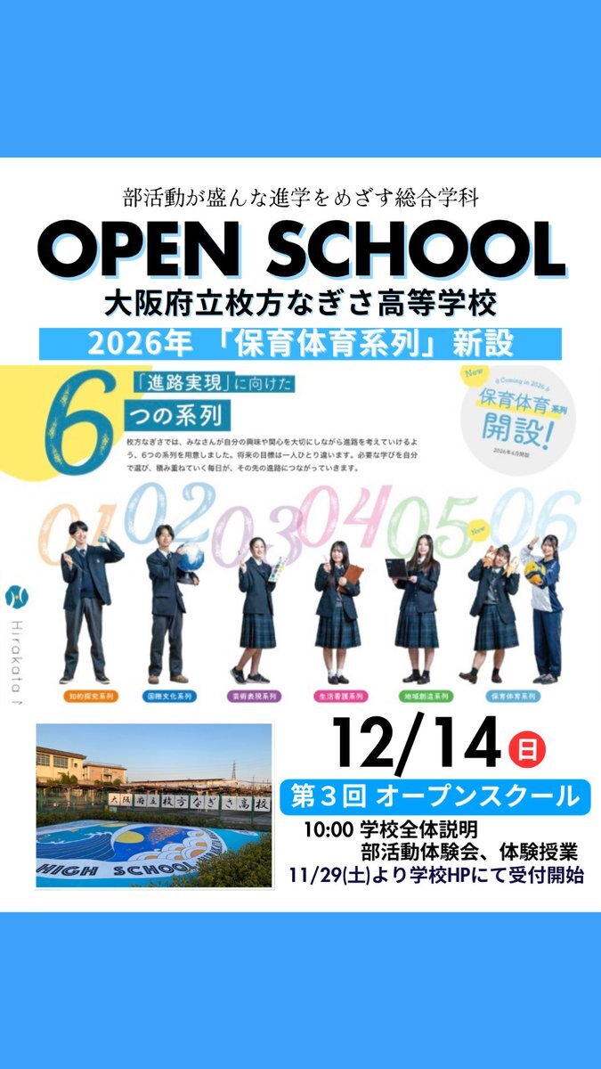 12/14(日)に第3回オープンスクールを行います 9:30 受付開始 10:00 総合学科に関する全体説明 10:40 部活動体験、体験授業など交流会 ※別途個別相談会の時間も設けます 〈お申し込み〉 11/29(土)〜12/3(水) ※学校ホームページにて受付 皆さまのお越しをお待ちしております #枚方なぎさ #総合学科 pic.x.com/NV9HZeQhYV
