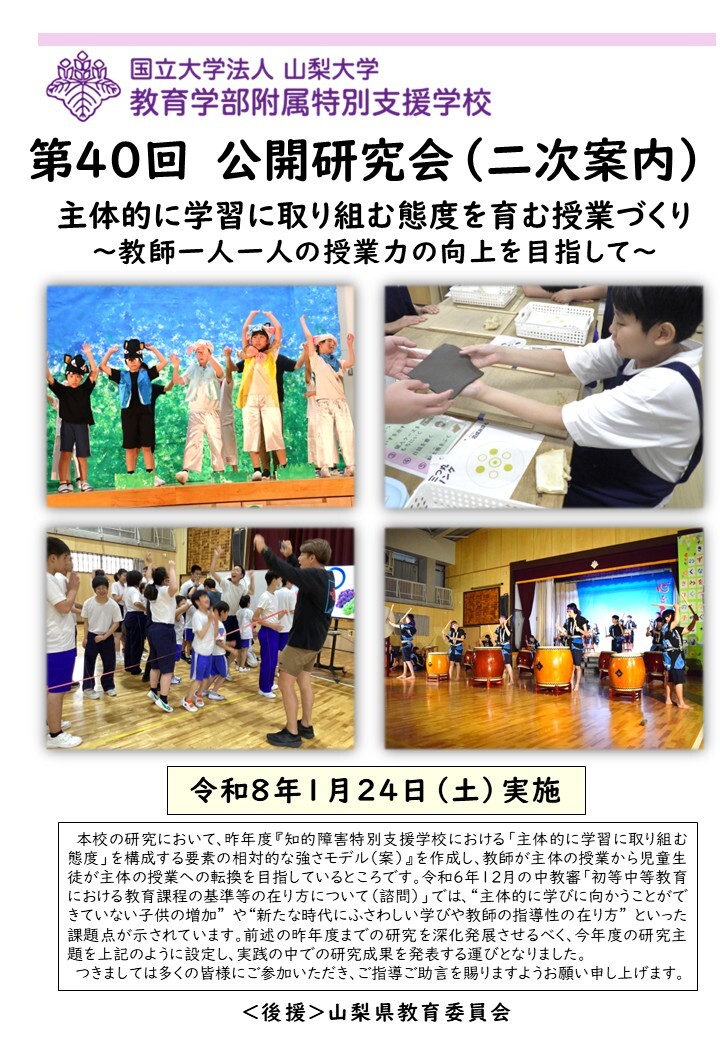 2026年1月24日(土)、本学教育学部附属特別支援学校では「第40回公開研究会」を開催いたします。お申込み締め切りは、12月19日(金)まで。詳細は本学HPをご覧ください。 #山梨大学 #特別支援 #公開研究会 #総合的な学習の時間 yamanashi.ac.jp/55584 pic.x.com/YuXBJbXgJD