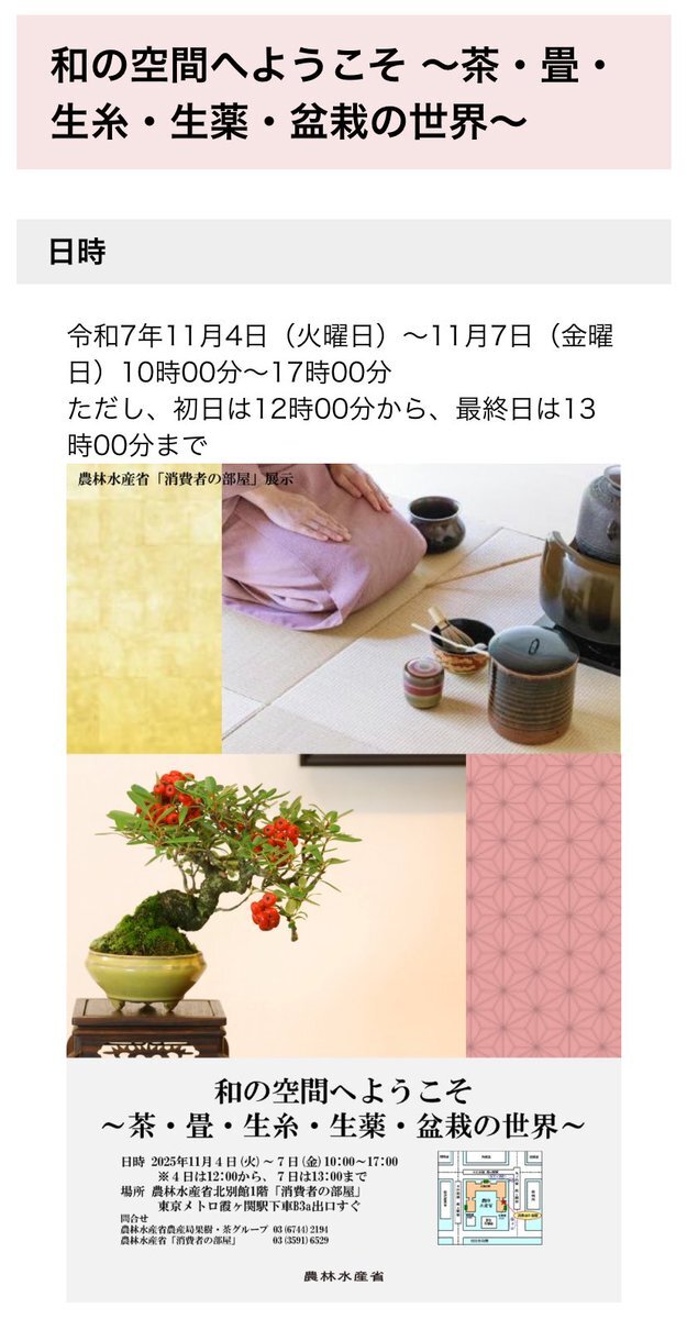 📢イベントのお知らせ🌳 『和の空間へようこそ~茶・畳・生糸・生薬・盆栽の世界~』 場所:農林水産省北別館「消費者の部屋」 日時:11/7(金)まで 詳細はこちら↓ maff.go.jp/j/syouan/heya/… #職人 #盆栽 #庭園 #花スタグラム #趣味の時間 #山野草 #かわいい花 #植物のある暮らし #緑のある暮らし pic.x.com/CiHWoyIRZr
