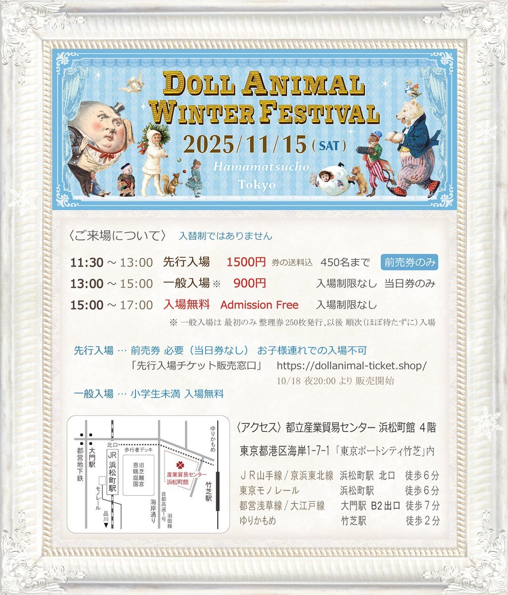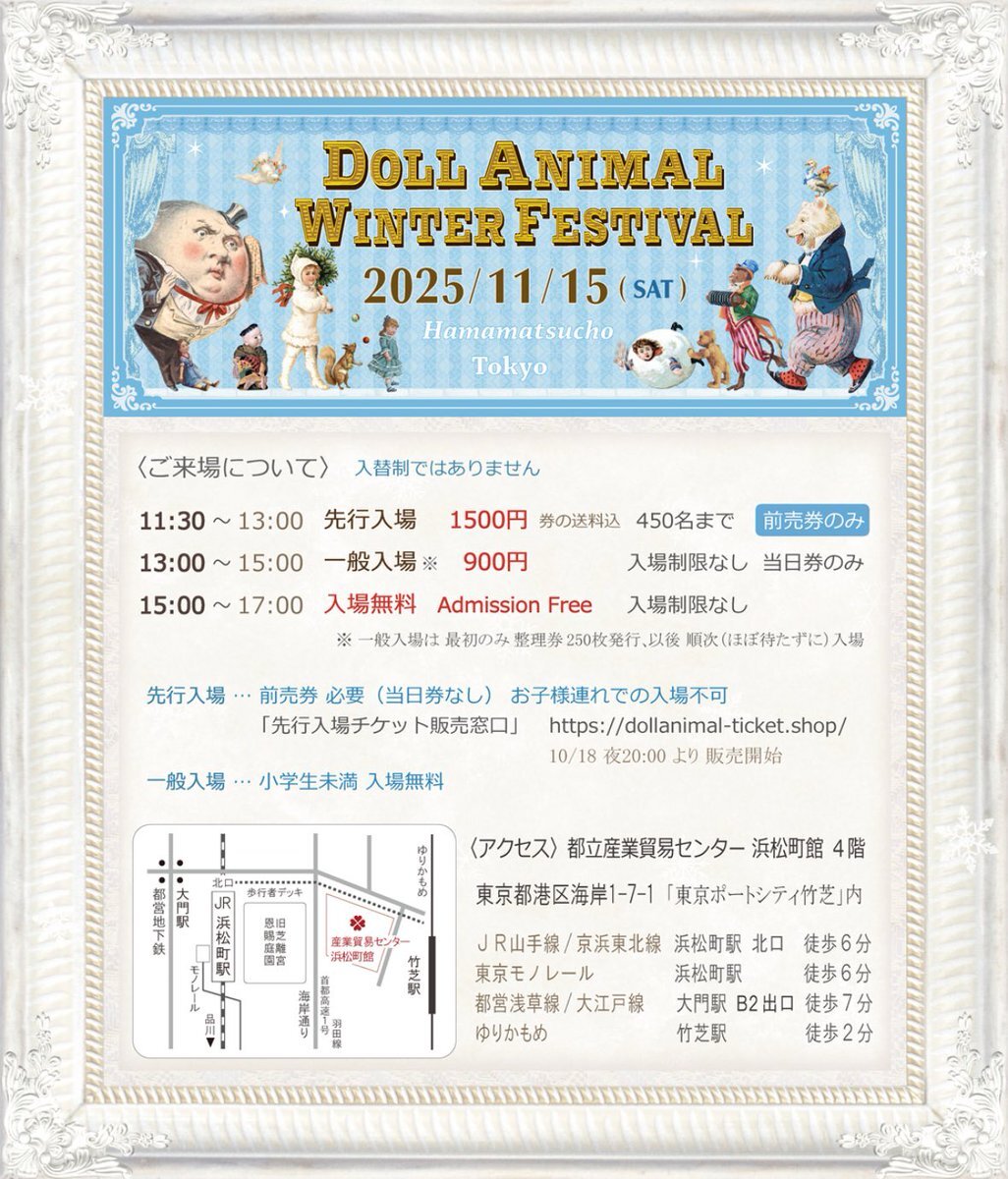 ドールアニマルウィンターフェスティバル 『先行入場チケット』の販売は 今週 11/1(23:59まで)まで! 『販売窓口』 dollanimal-ticket.shop 購入ガイド dwf.d.dooo.jp/stores_ticket.… 出展者紹介のページには参加者の作品画像やコメントを掲載しています dwf.d.dooo.jp/dwl/w_25list.h… #ドールアニマル