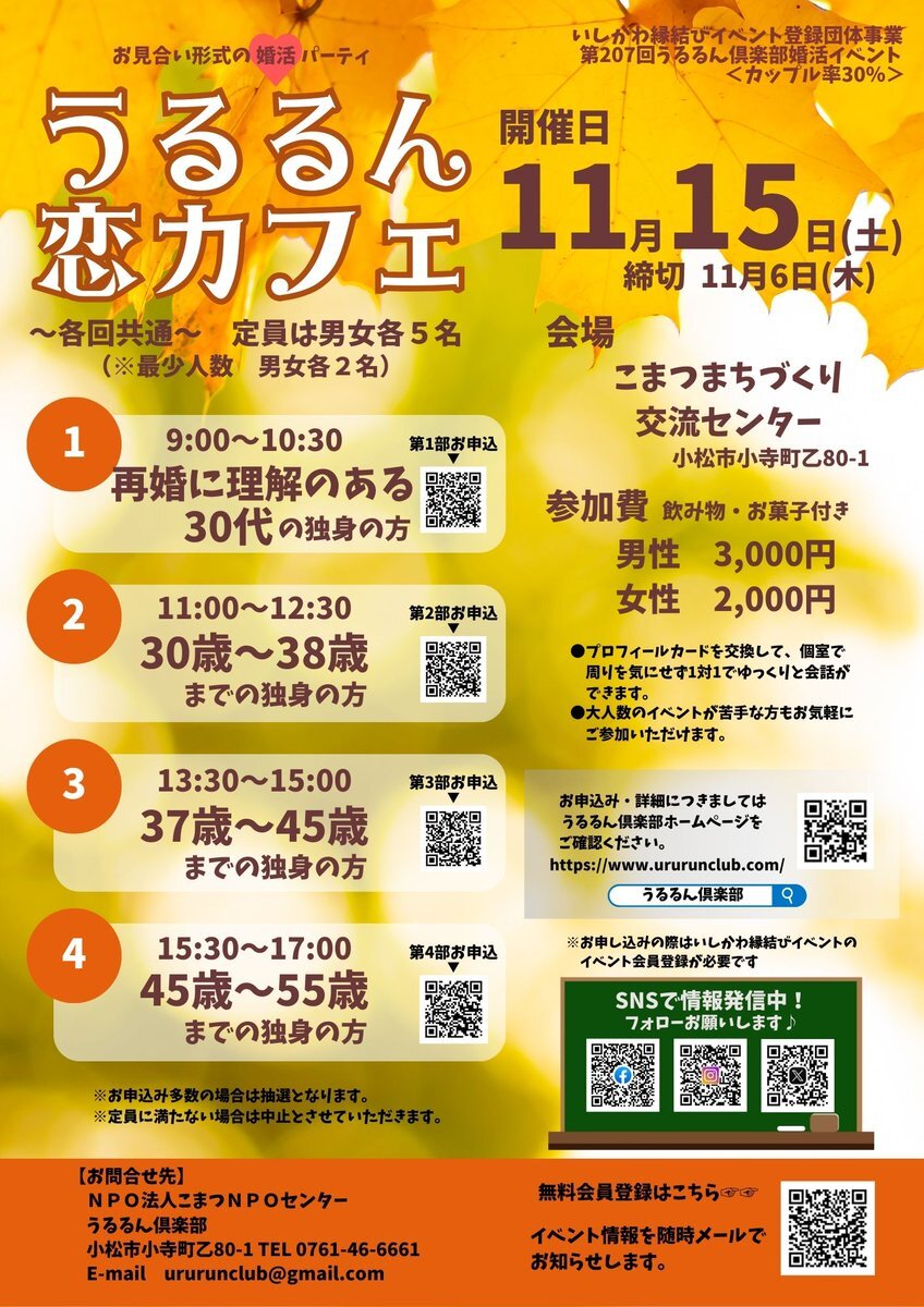 11/15(土)開催💗うるるん恋カフェ ❣️1対1でゆっくり異性とお話できます❣️ 開催日🗓️11/15(土) 対象✅30~55歳 会場📍こまつまちづくり交流センター 参加費👛男性3000円 女性2000円 締切⏰11/6(木) 詳細・お申込➡️ururunclub.com #婚活 #イベント #パーティー #婚活イベント #石川県 #小松市