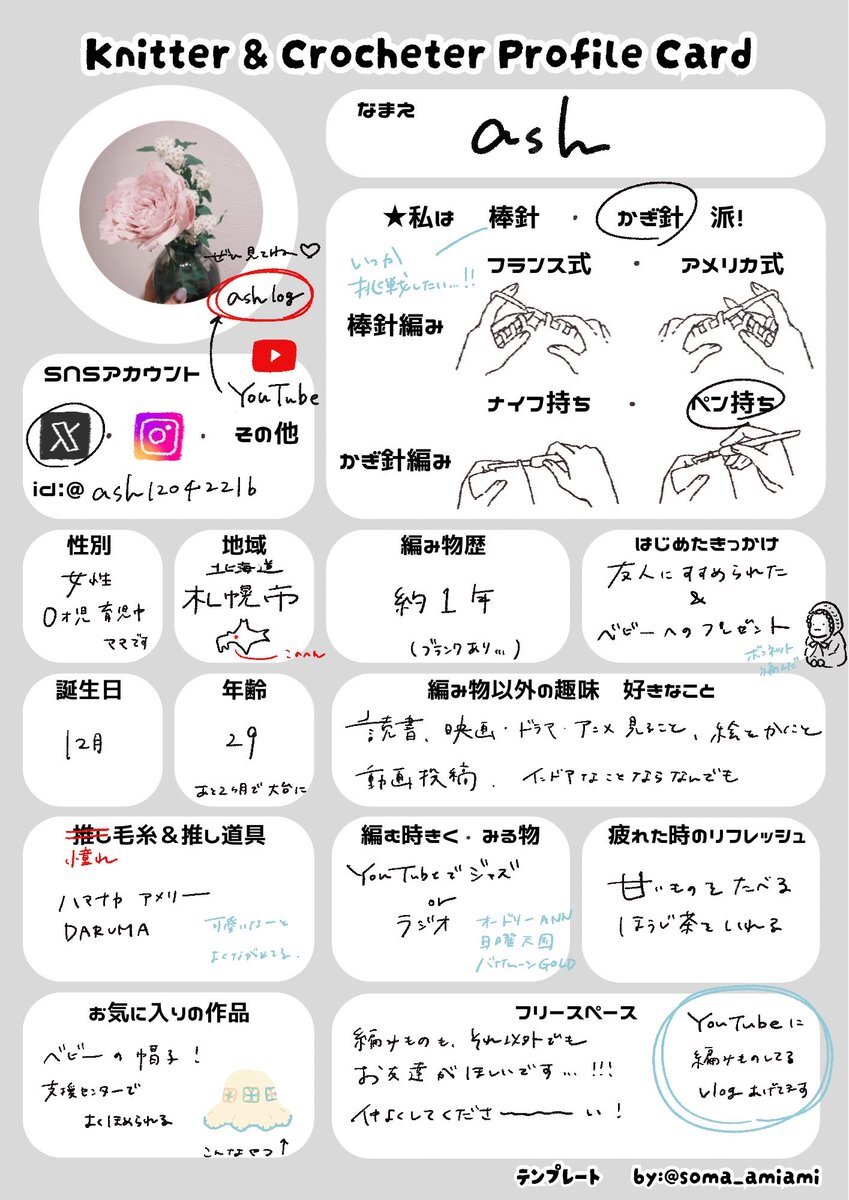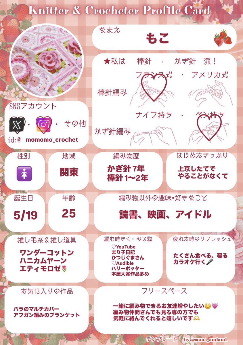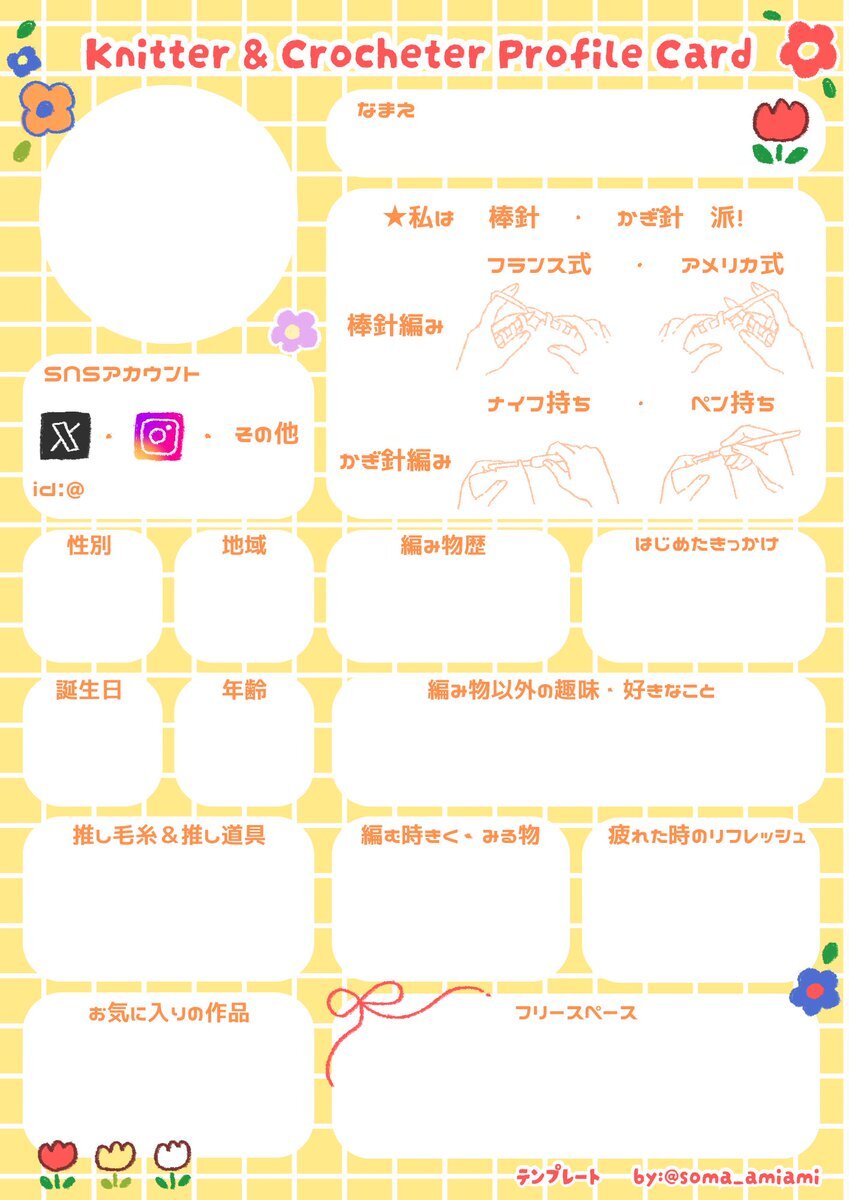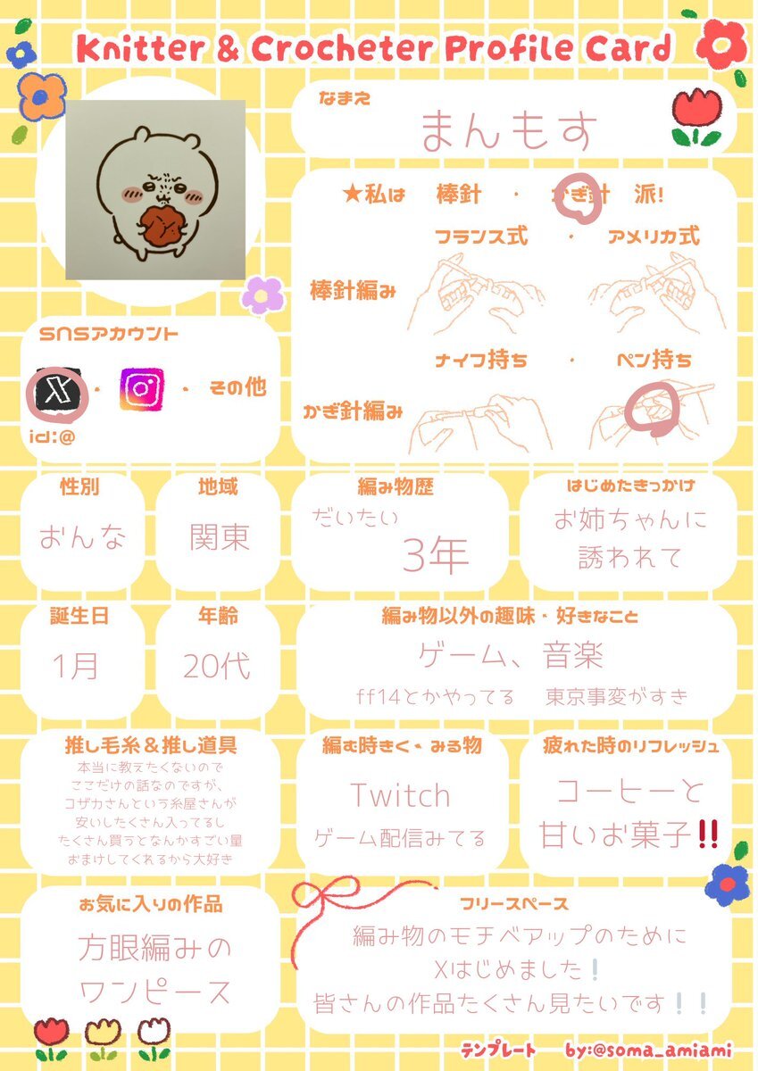 【✨️GW編み物アカさん繋がろうキャンペーン✨️】 編み物界隈の皆様へ日頃の感謝をこめまして…(?) 編みアカさん向けプロフィールテンプレートを作成しました💌 どなたでもご自由にお使いください!! #編むプロフ書いたよ でお知らせくださると嬉しいです♪ ⬇️リプにシンプルver続きます!