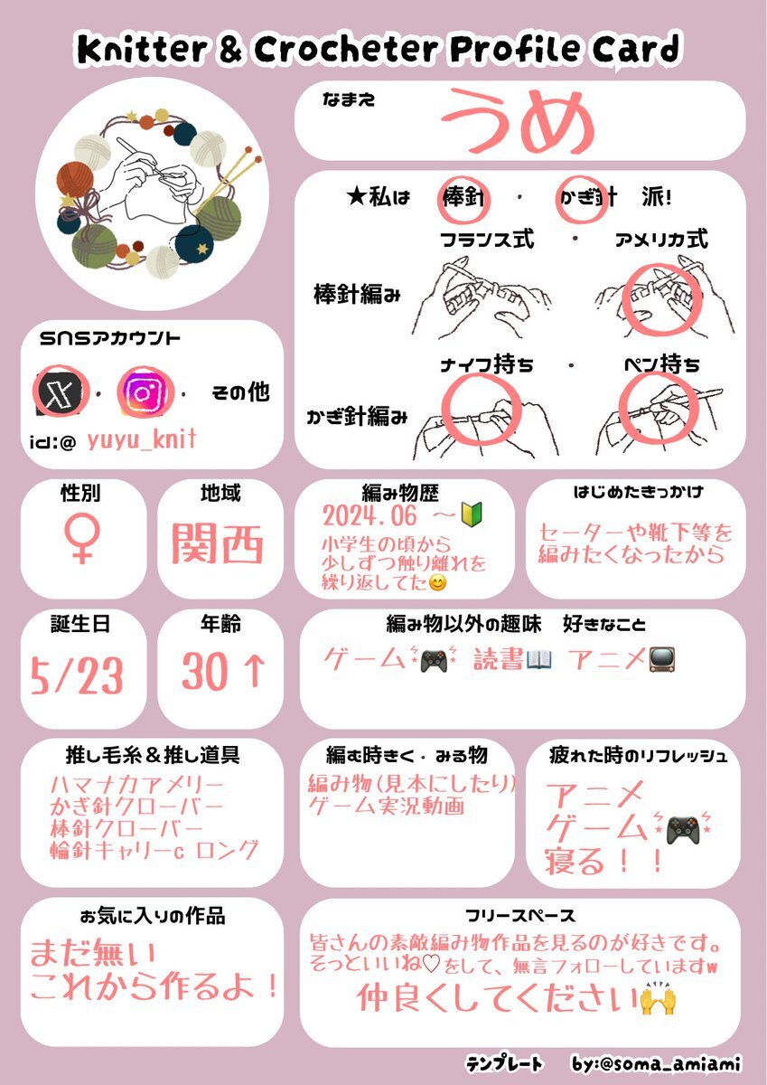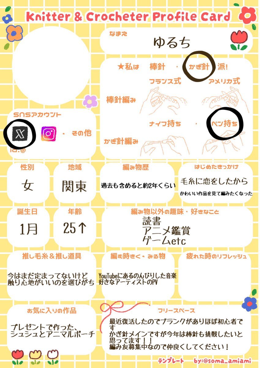 テンプレートをお借りしてプロフ作ってみました🧶 0歳育児の合間に少しずつ編み編みしてるので、あまり作品はないですが編んでる時間が好き!気になってくれた方ぜひ仲良くなりたいです…🤍 #編むプロフ書いたよ #編み物好きな人と繋がりたい pic.x.com/Vlj0UpMr1S