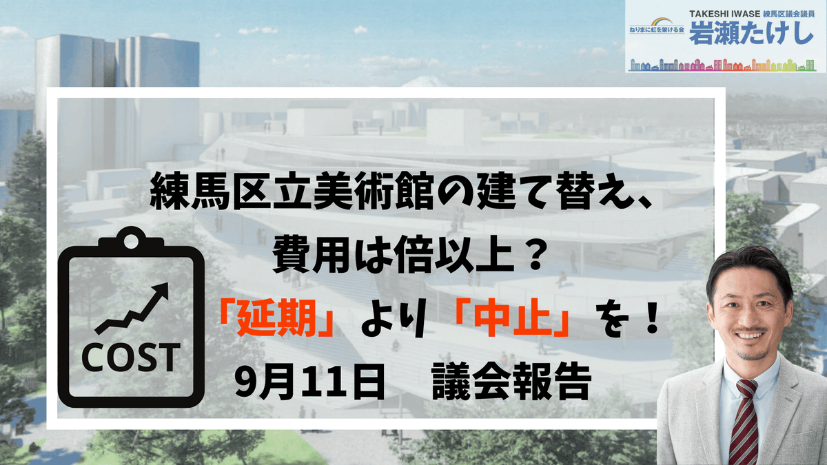 【#練馬区立美術館 の建て替え、費用は倍以上の恐れ!延期でなく中止を!】既にかかった費用は8億3400万円。民間へ聞き取りでは工事費が倍以上になる恐れも。4年以上延期する恐れも。将来に不安や負担を先送りしないために延期でなく中止を訴えました。ご一読ください! iwasetakeshi.net/2025/09/nerima… pic.x.com/XPwBodEeK8