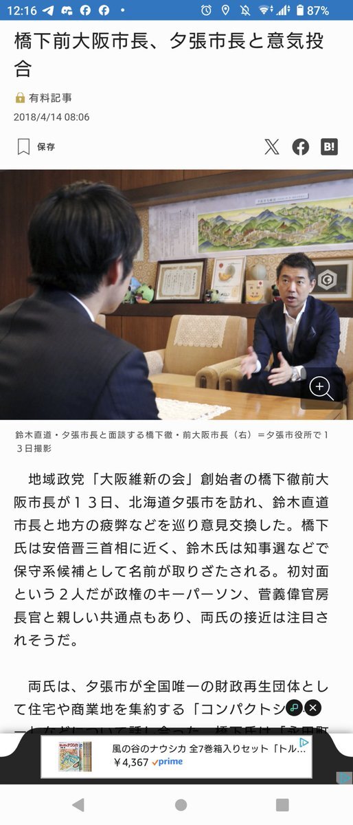 ほら、これが #鈴木直道 北海道知事の正体だよ。そして日本維新の会が緊縮であることの証拠だよ。 #織原の経済学のメモ 人口減対応:橋下前大阪市長、夕張市長と意気投合 | 毎日新聞 mainichi.jp/articles/20180… pic.x.com/RFSOCetre1