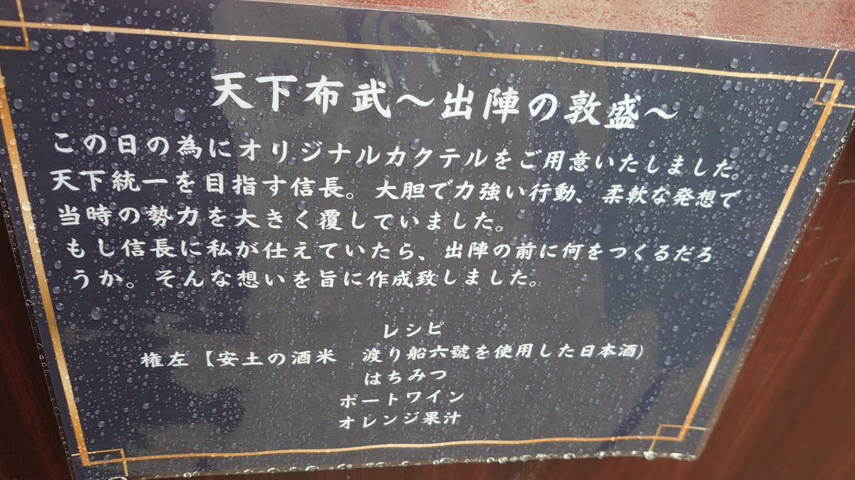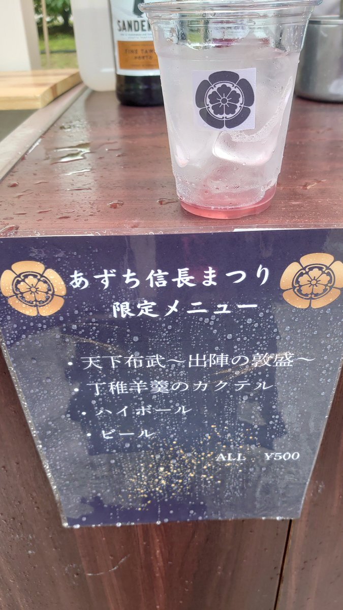 信長様の敦盛の舞をイメージして作られたオリジナルカクテル♪ 一口飲んであ、おいし!!ってなった。雨じゃなければ…っずっと飲んでたのに←← 周りにツマミにできる屋台もたくさんあったのになぁぁぁ← 野洲にお店あるって聞いたのでいつか行ってみたい♪ #あづち信長まつり #織田信長公 pic.x.com/uEoZPzm2MK