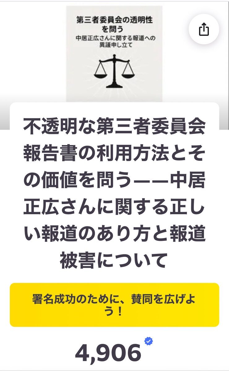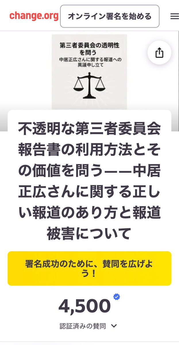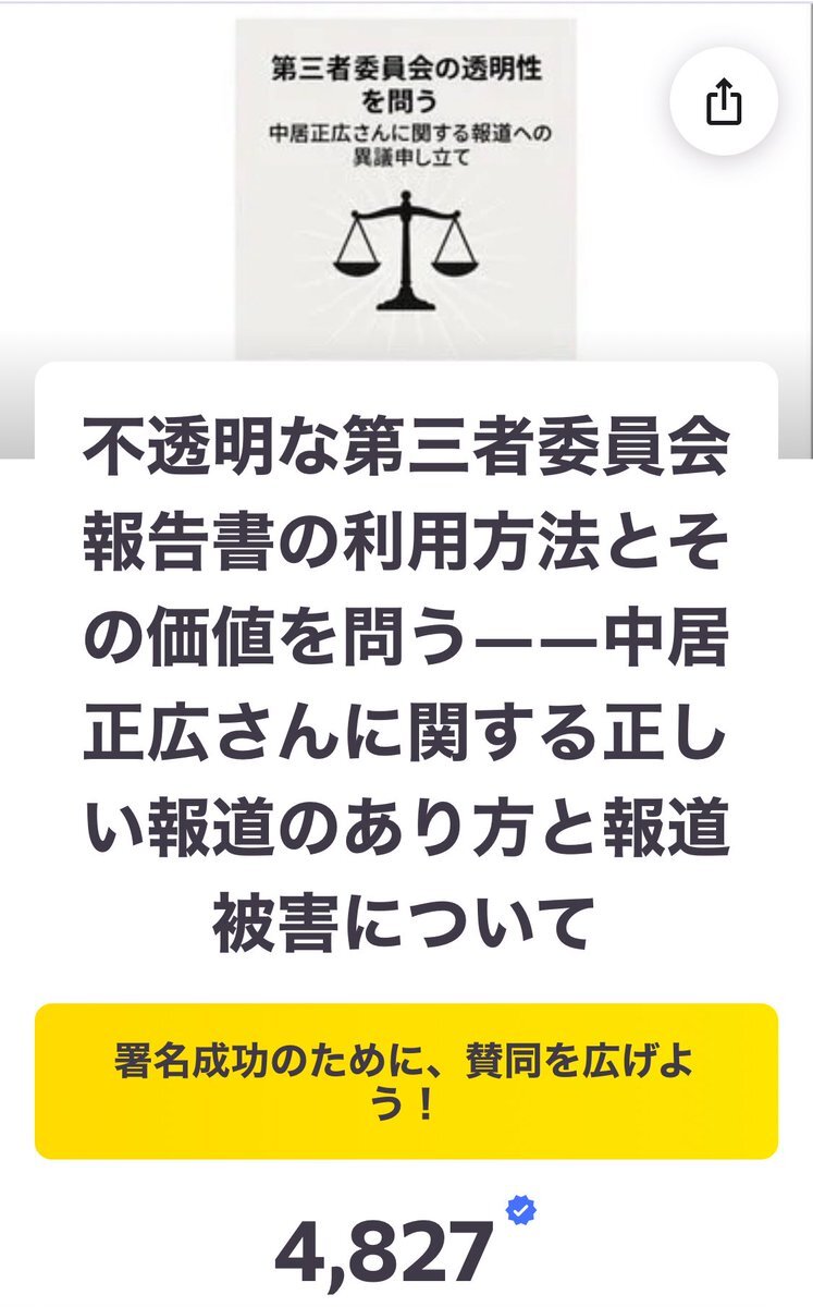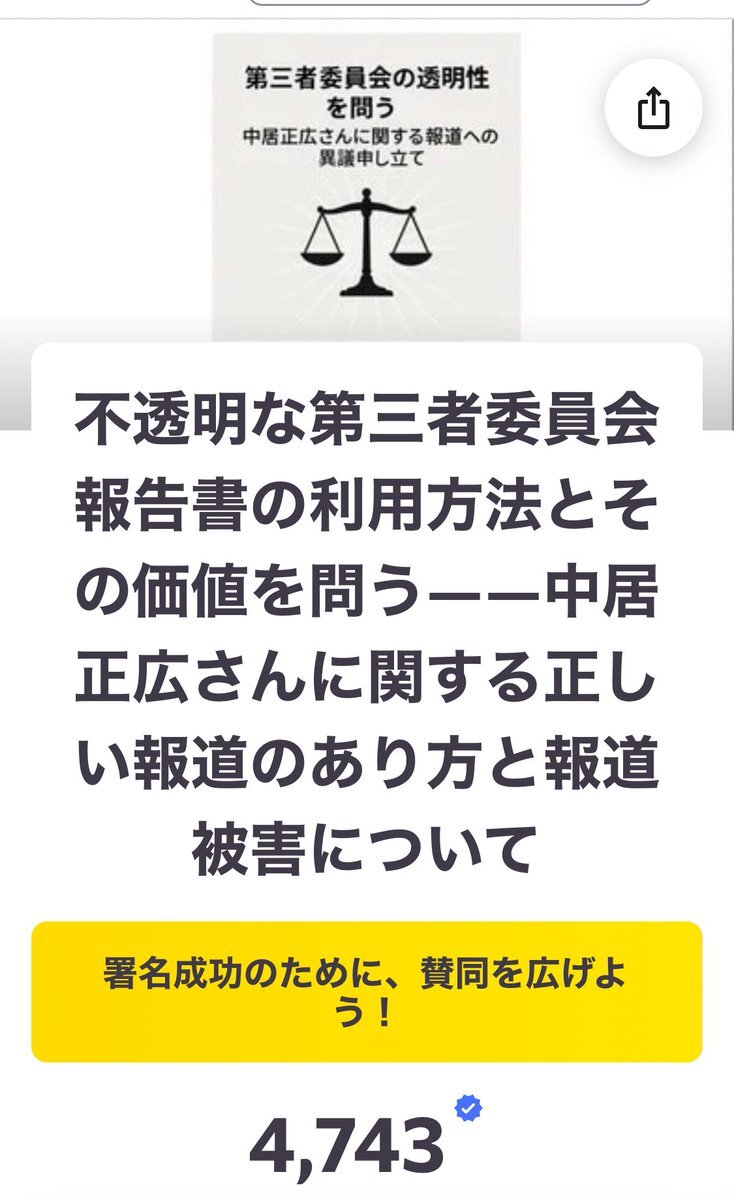 署名5000人迄100人をきりました‼️ すでに署名をしていただいている方も、署名サイトのコメント欄にご記入いただければ、中居くんの元へ貴方の応援メッセージをお届けします。 ✍️→chng.it/GRcXSssp8Q 尚5000人到達で弁護団へ提出となります🙏 詳細は画像でご確認🙇 #中居くんの名誉回復 #署名活動 pic.x.com/42f1atRAkT x.com/misamisako31/s…