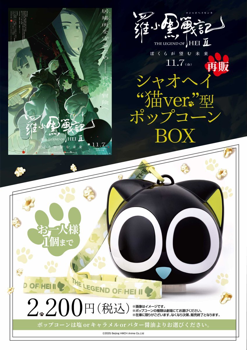 #羅小黒戦記 2 ぼくらが望む未来』 公開記念「シャオヘイ“猫ver”型ポップコーンBOX」 "再販売"決定! 再販売:11/15(土)~ 価格:2,200円(税込) ※お一人様一点限り 即完売となったポップコーンBOXの再販売が決定しました!ぜひこの機会にお求めを! #ロシャオヘイセンキ cinecitta.co.jp/news/246 pic.x.com/F6d1DpECTa