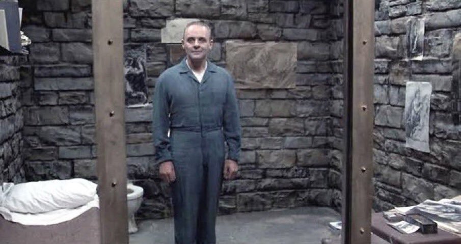 『羊たちの沈黙』小ネタ。レクターは鉄格子&ナイロン製ネットを張った牢に居るはずだったが、観客から表情が見えにくいだろうと監督が指摘。美術部が穴の空いたアクリル樹脂で仕切られた酒屋をヒントに、この独房が作られた。 #羊たちの沈黙 pic.x.com/ZiOSMcnhBK