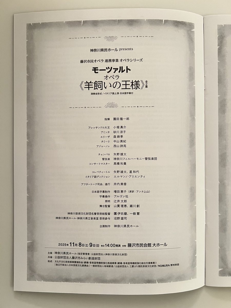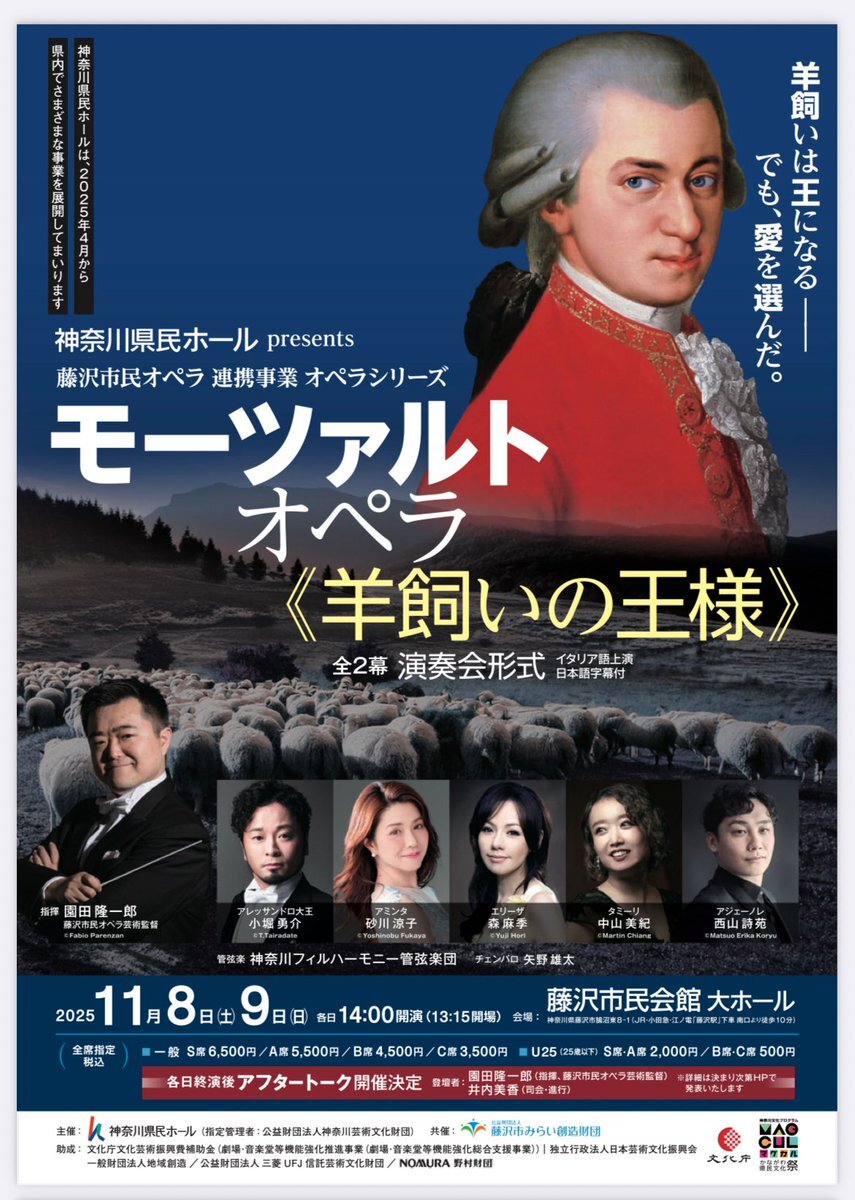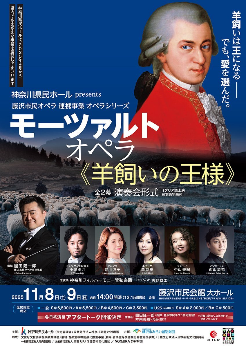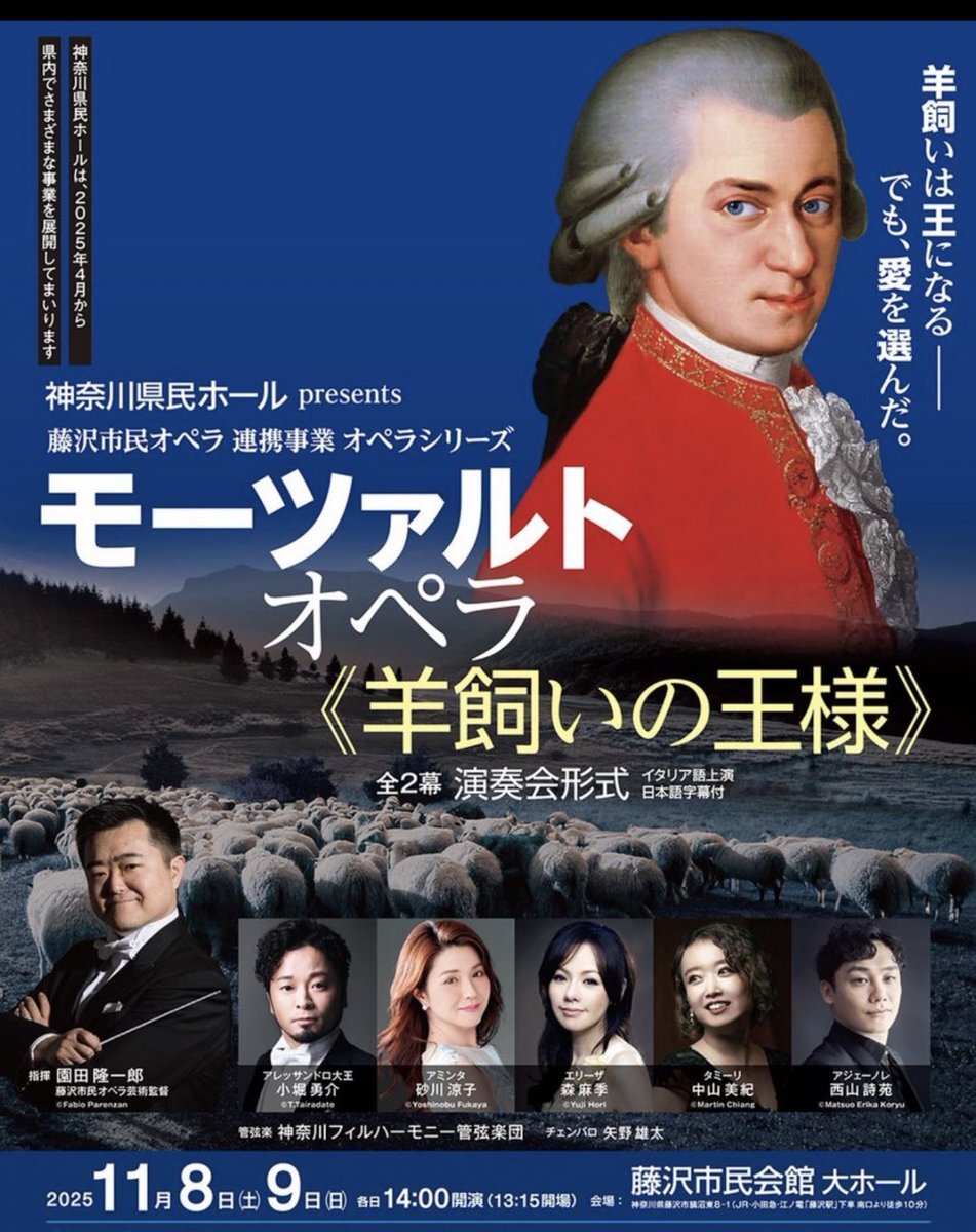\間もなく開催!/ #神奈川県民ホールpresents 藤沢市民オペラ 連携事業 オペラシリーズ #モーツァルト オペラ《#羊飼いの王様》全2幕 (演奏会形式/イタリア語上演・日本語字幕付) 11/8(土), 9(日) #藤沢市民会館 大ホール 終演後 #アフタートーク 開催 🎫公演詳細 kanagawa-kenminhall.com/d/opera_fujisa… pic.x.com/18JqLV6RU9