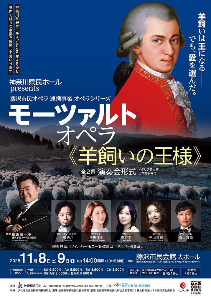 【当日券&上演時間情報】 #神奈川県民ホールpresents 藤沢市民オペラ 連携事業 オペラシリーズ #モーツァルト オペラ《#羊飼いの王様》全2幕 11/8(土), 9(日) #藤沢市民会館 大ホール 🐑当日券 13:15~販売 👑上演時間 約2時間20分 ▼詳細はこちらよりご確認ください kanagawa-kenminhall.com/news_detail/28…