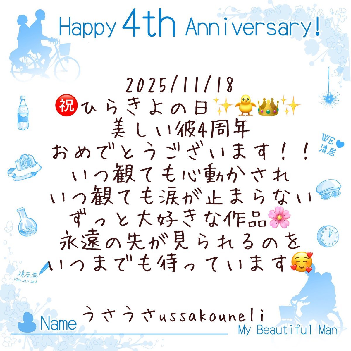 11月18日✨美彼放送4周年記念🎊 この作品に携わって、美しい彼の世界を私たちに届けてくださった全ての人々に感謝申し上げます🥰 本当に素晴らしい作品をありがとうございます🙏❤️ #美しい彼 #美しい彼ファンアートメッセージ2025 #ひらきよの日 pic.x.com/zMHOAvuIyw