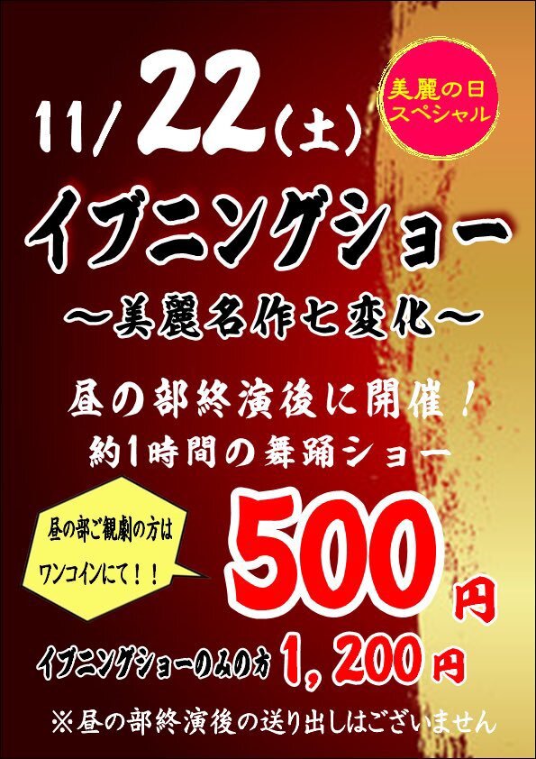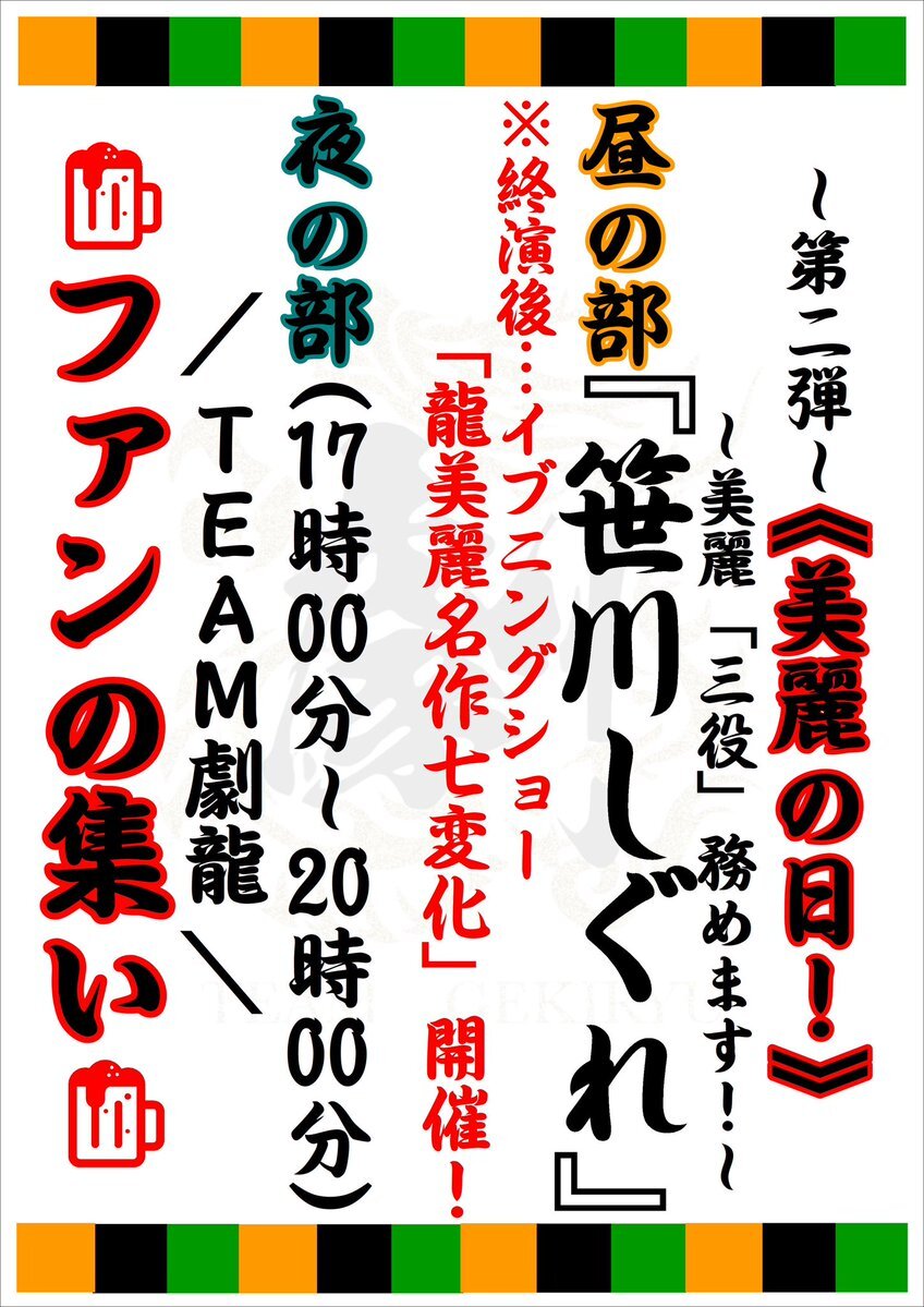 🐲#TEAM劇龍🐲 11/22(土) ☀️~第二弾~《#美麗の日》 『笹川しぐれ』 ※終演後「龍美麗名作七変化」の イブニングショー開催😎 🌙🍺#TEAM劇龍ファンの集い🍺 芝居も舞踊も #美ー様 出ずっぱり😳✨ (芝居では【三役】‼️) 美ー様づくしの1日🤩 大満足を約束します🤝🔥 #龍美麗 #行田もさく座 by🔔🌴 pic.x.com/UakJckMIJT