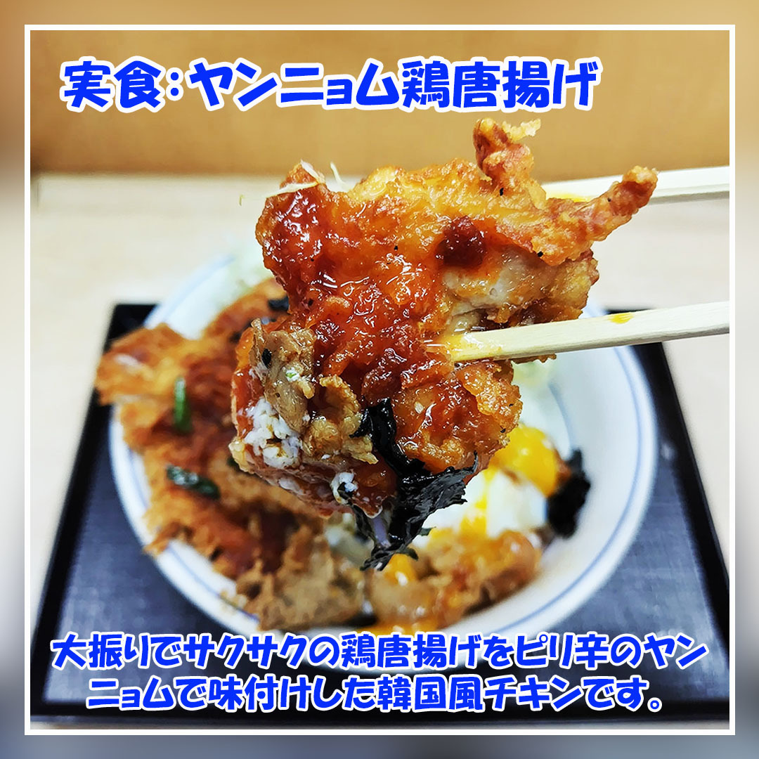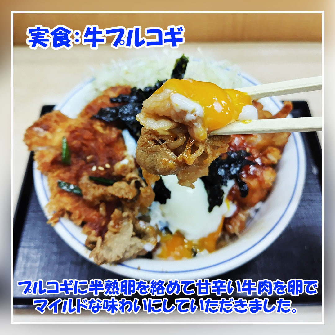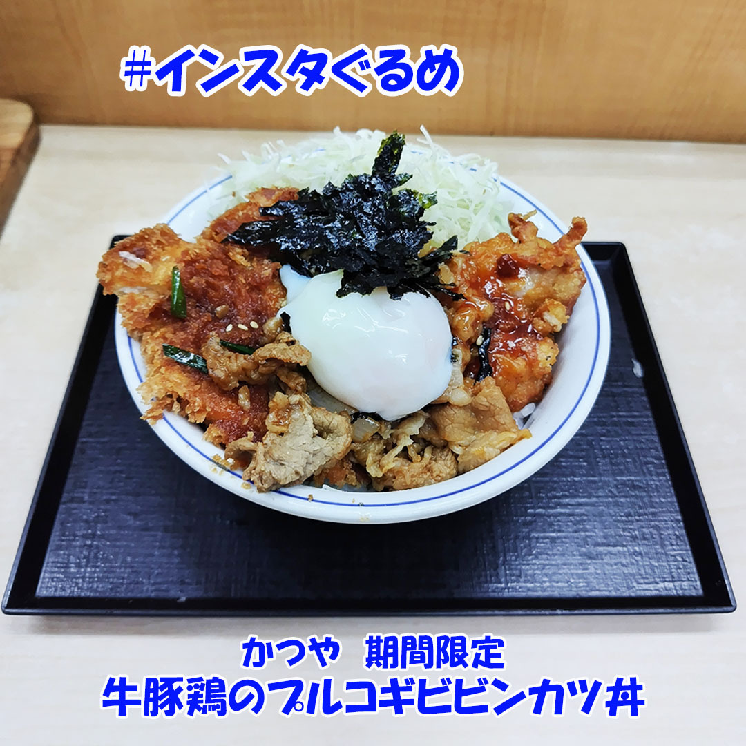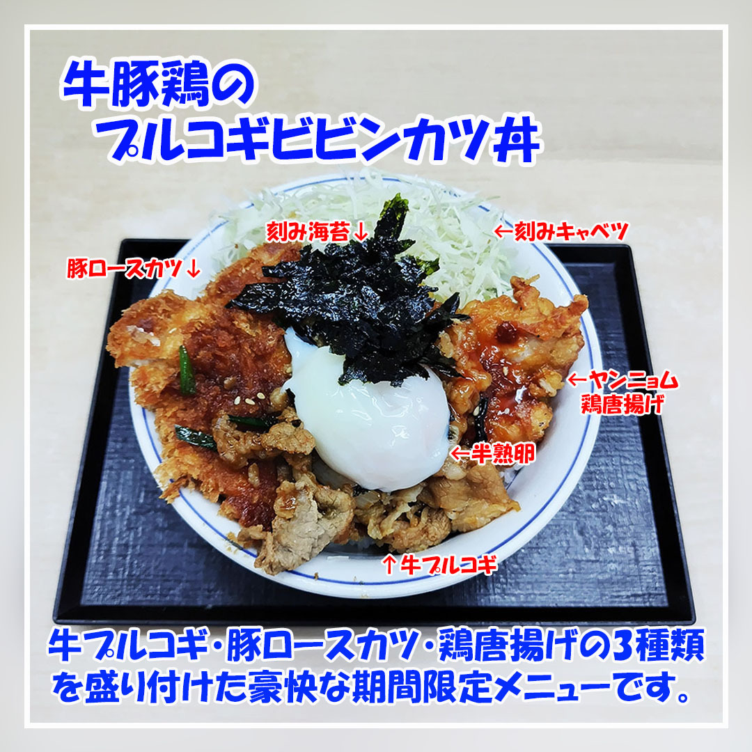 今回は #かつや の 期間限定 #牛豚鶏のプルコギビビンカツ丼 を食べました。 白飯に牛プルコギ・豚ロースかつ・ヤンニョム鶏唐揚げの3種類をメインで載せています。 併せて、半熟卵・刻み海苔・千切りキャベツを載せたバランスのよい丼メニューです。 #拡散希望 #美味しいを伝える #インスタグルメ pic.x.com/r62n2fyDNL