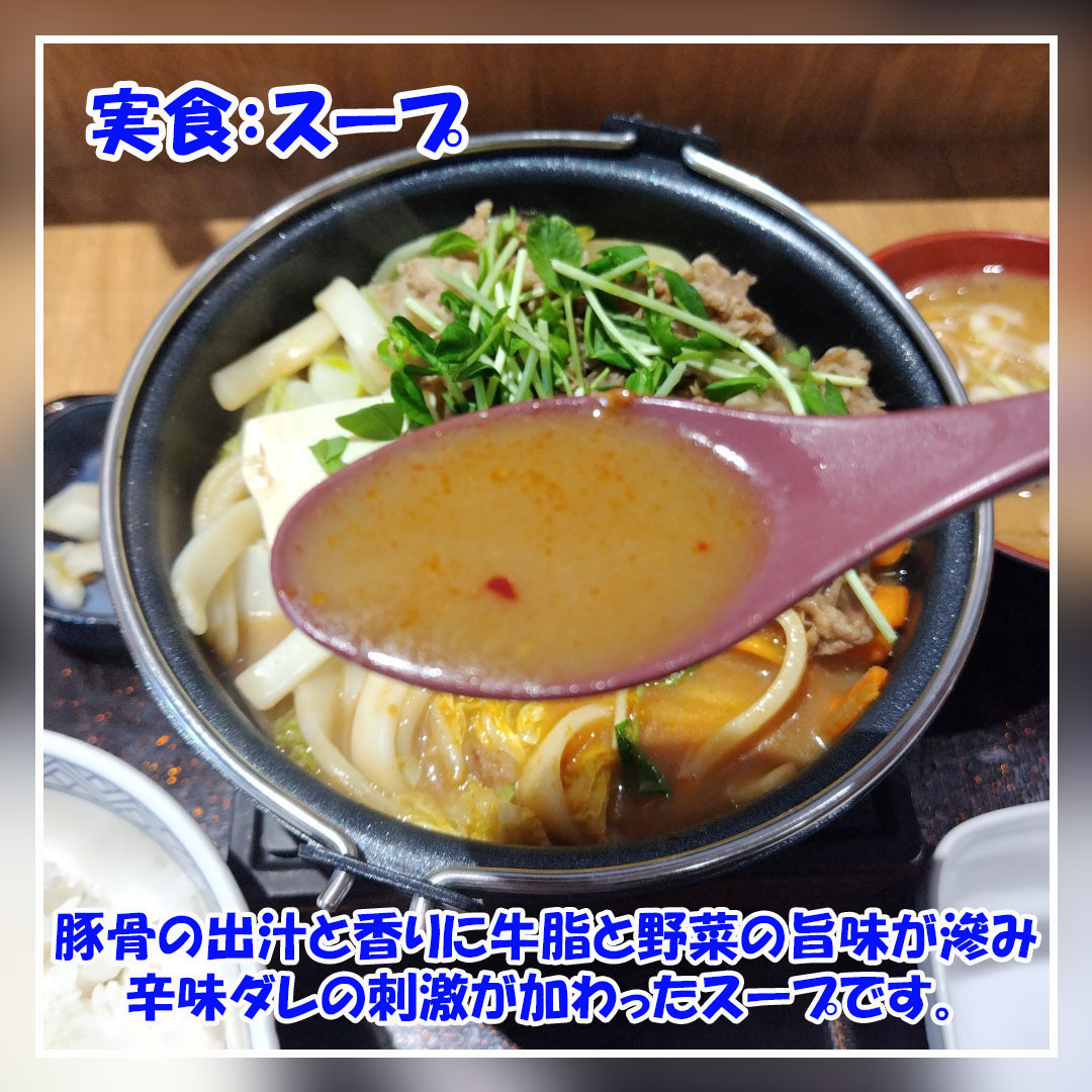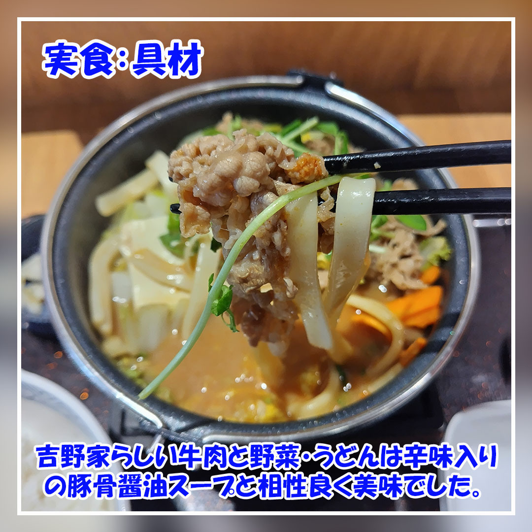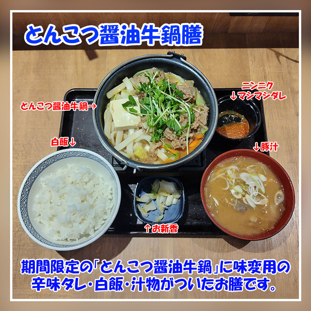 今回は #吉野家 の期間限定 #とんこつ醤油牛鍋膳 に豚汁を追加。 豚骨醤油味のスープに牛肉・野菜・豆腐・うどんを入れて煮込んだ熱々の鍋に、辛味ダレを入れていただきました。 豚骨出汁と香りに牛肉や野菜の旨味と辛味ダレの刺激も入り美味でした。 #拡散希望 #美味しいを伝える #インスタぐるめ pic.x.com/6Rq3hs5NO8 x.com/yoshinoyagyudo…