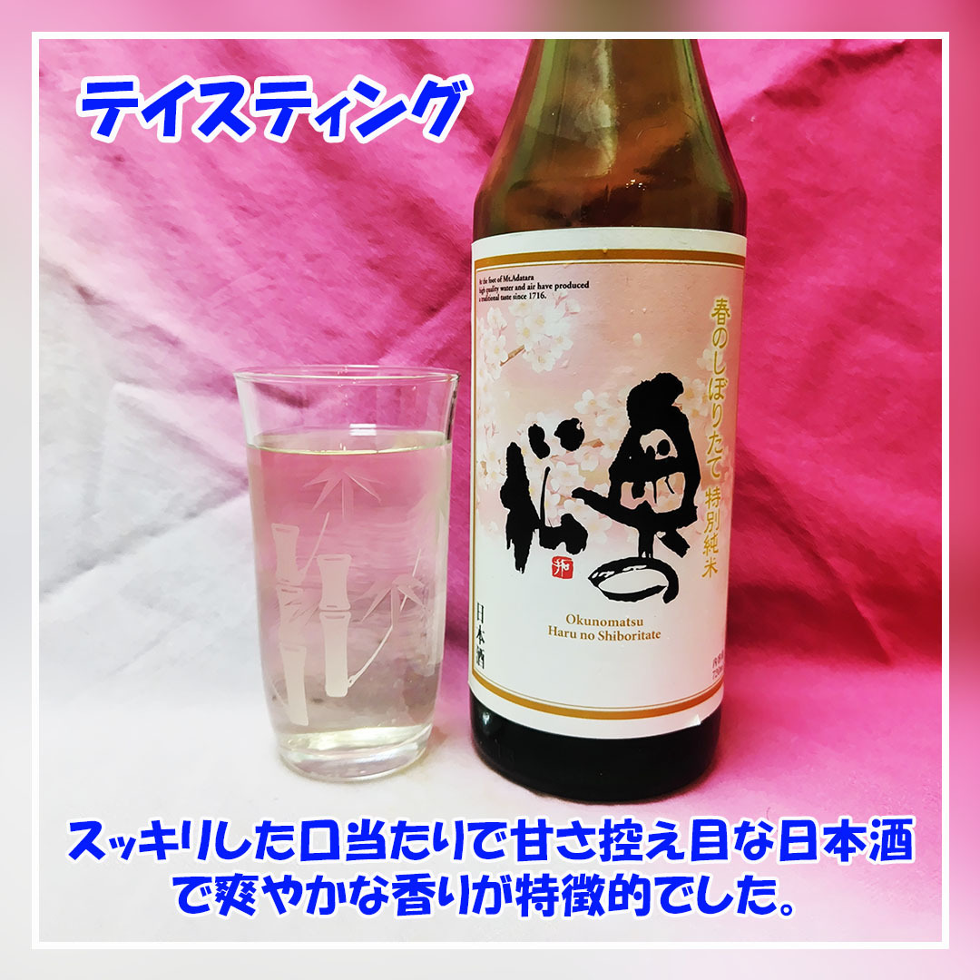 東北方面出張でお土産に購入した #奥の松酒造 の #春のしぼりたて特別純米 です。 奥の松酒造は享保年間創業の300年以上続く福島県二本松市の蔵元です。 スッキリした口当たりで甘さ控えめな味わいで、日本酒らしい爽やかな香りも楽しめる日本酒です。 #拡散希望 #美味しいを伝える #飲酒タグラム pic.x.com/z5h4UktheP
