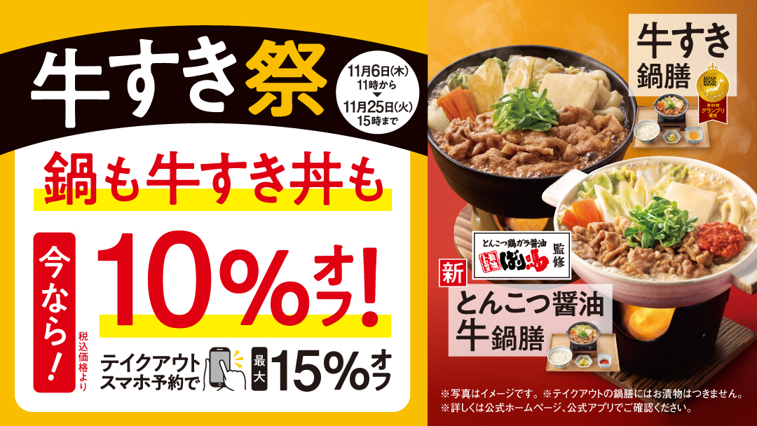 ┏━━━ ✨牛すき祭✨ ━━━┓ 牛すきシリーズが 税込価格から1⃣0⃣%引き WEBオーダー限定で1⃣5⃣%引き ┗━━━━━━━━━━━━━━┛ 期間⏰:11月25日(火)15時まで この機会に吉野家の冬の名物を おトクにたのしんでね٩(ˊᗜˋ*)و 詳細はこちらから🔗 yoshinoya.com/campaign/gyusu…