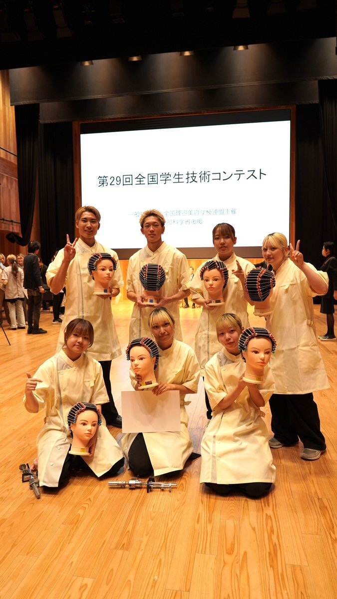 昨日、全国理容美容学校連盟主催の「第29回全国学生技術コンテスト」に本校学生7名が出場し、1年生1名が優秀賞を受賞しました💐✨!惜しくも入賞できなかった選手たちも、最後まで一生懸命頑張る姿がとても輝いていましたー✨!#美容学校 #美容専門学校 #美容学生 #美容師になりたい #コンテスト出場 pic.x.com/wpaeUb37uk