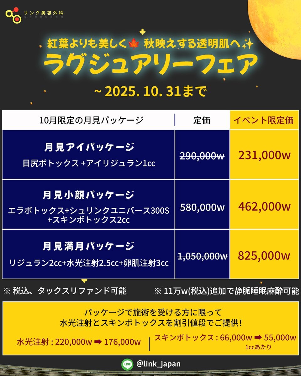 10月限定🌙 秋映え肌アップデートキャンペーン💫 額フィラー1㏄:88,000w エラボトックス:88,000w 多汗症ボトックス:88,000w (100unit 基準) ボディーボトックス:88,000w (100unit 基準) ガミースマイルトックス:77,000w 《税込》 「ラグジュアリーフェア」で 大人気の月見パッケージもお得に!