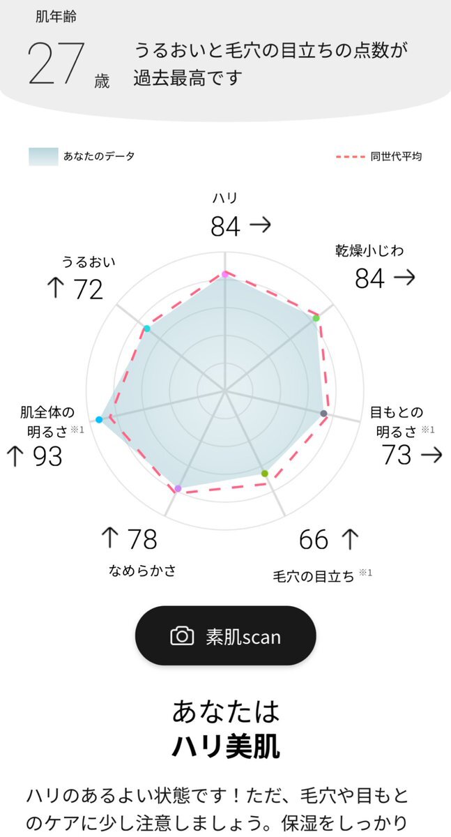 【素肌scan結果】 うるおい・毛穴の目立ちが過去最高🌿 肌年齢27歳で“ハリ美肌”評価✨ 以前は乾燥とくすみで悩んでたけど、 攻めより“整えるケア”に変えたら 一気に安定するように👍🏻 毛穴ケアと目元ケアに力入れていこ!🫧🤎 #スキンケア #敏感肌ケア #美容記録 pic.x.com/ldksLnXXmp
