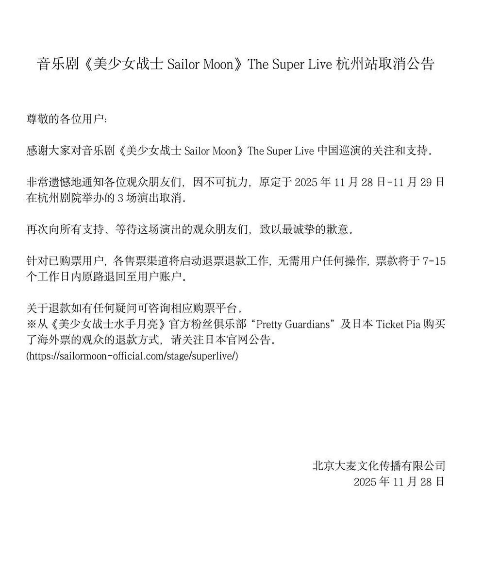 「#美少女戦士セーラームーン The Super Live」杭州公演の中止、本当に胸が痛みます。 日本から遠くまで来てくださった主創・出演者の皆様が舞台に立てなかったことを思うと、とても切ないです😣 自分自身も、ずっと楽しみにしていた公演を見られないのがただただ残念です😭 #SailorMoonTheSuperLive pic.x.com/NlVpnYrRdD