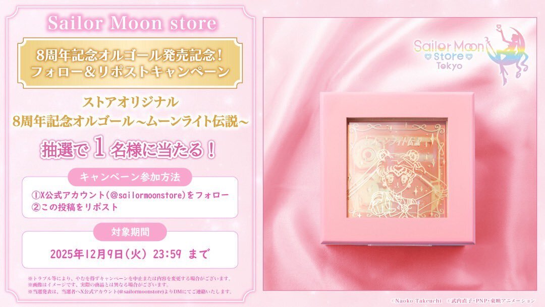 🎁プレゼントキャンペーンのお知らせ🎁 #美少女戦士セーラームーン 公式ストア #SailorMoonstore 8周年を記念して 「ストアオリジナル 8周年記念オルゴール」が、 🌙抽選で1名様に当たる!キャンペーン🌙 を実施いたします! pic.x.com/7F5VPFmAXW