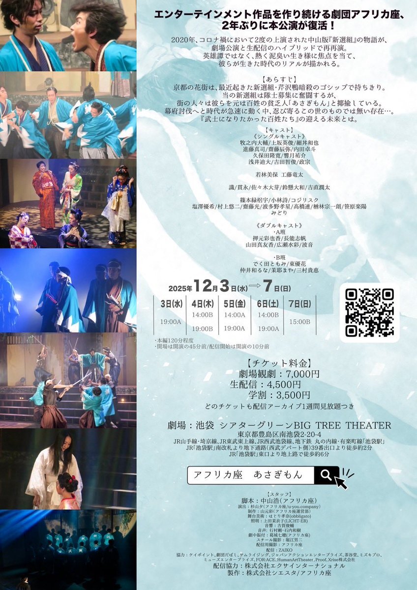今日は22時から #美男五人衆の休憩所 Xのスペースでまたまたやりますよー! 12月3〜7日に本番を控えた舞台 劇団アフリカ座「あさぎもん」 劇中に登場する美男五人衆が作品の見どころや稽古場のウラ話を語ります👀 お気軽に覗いてくださいね! africaza.zaiko.io/e/asagimon2025 #あさぎもん2025 #新選組 pic.x.com/TjhYOQUFOB