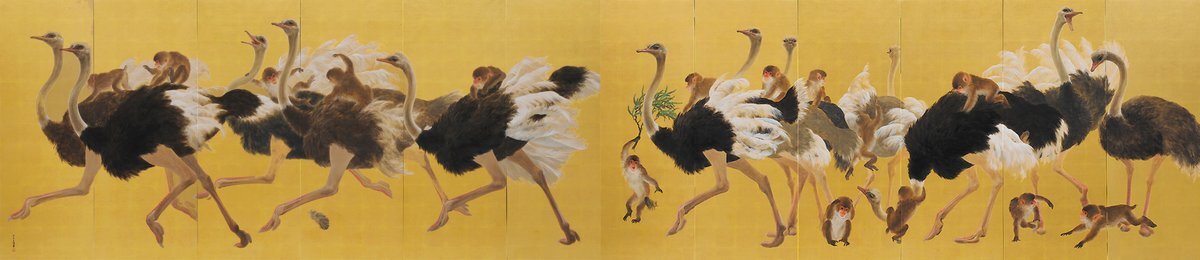 #現代鳥獣戯画 1階展示作品のご紹介 #平子真理 《MonkeyRace》2010年 子猿たちによるダチョウのレース。右隻はレース前,左隻はゴール手前と対比的に描かれた作品。ゴール手前で必死にしがみつく子猿やダチョウのまつ毛など細かな表現もみどことです。是非間近でご覧ください #郷さくら美術館 #日本画